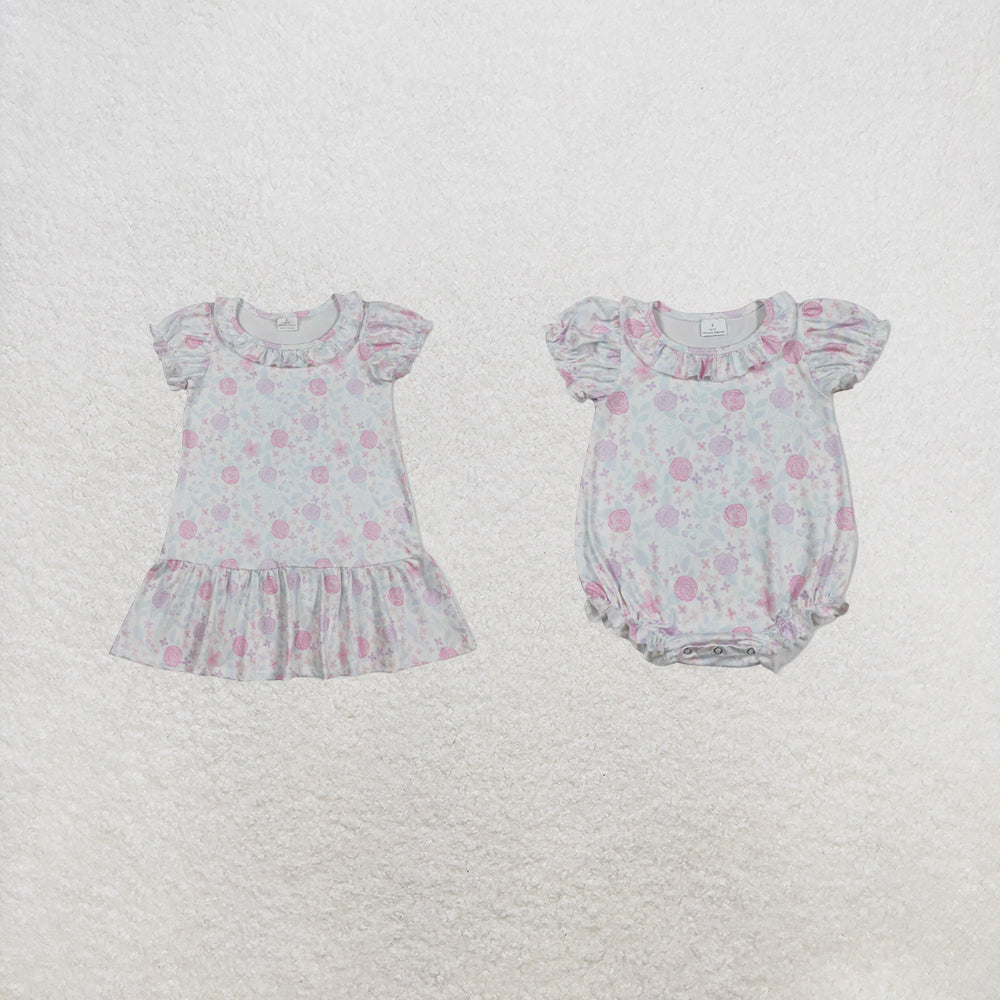 RTS Sibling Short sleeves pink lavender floral ruffle girls dress and romper