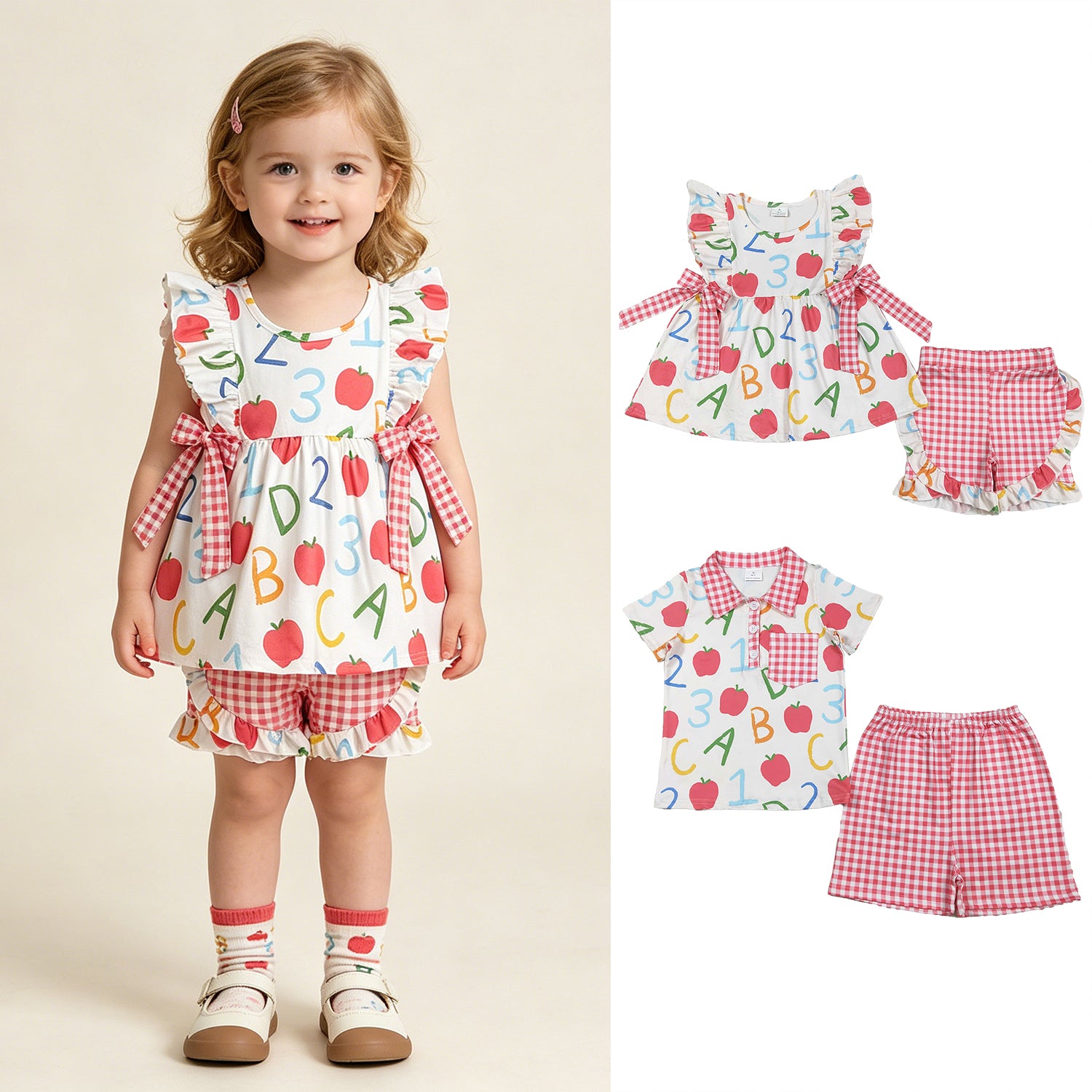 RTS NO MOQ (In stock )Short sleeves cherry bow top plaid shorts girls outfits