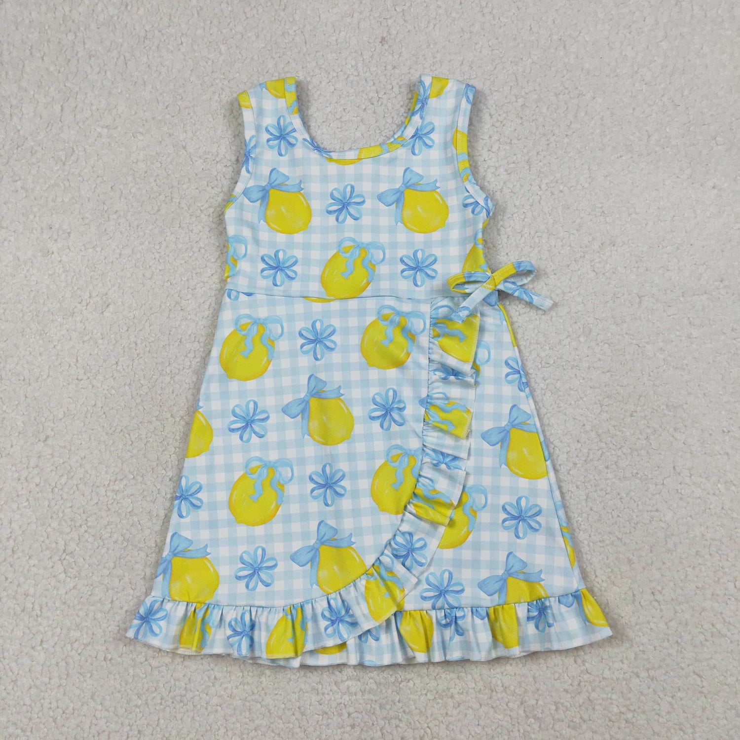 3.23 RTS NO MOQ (In stock)GSD3684 Kids Fashion Clothes Baby Girls Strap Blue Checked Bow Lemons Back Zip Yoga Active Shorts Ruffle Knee Length Dress