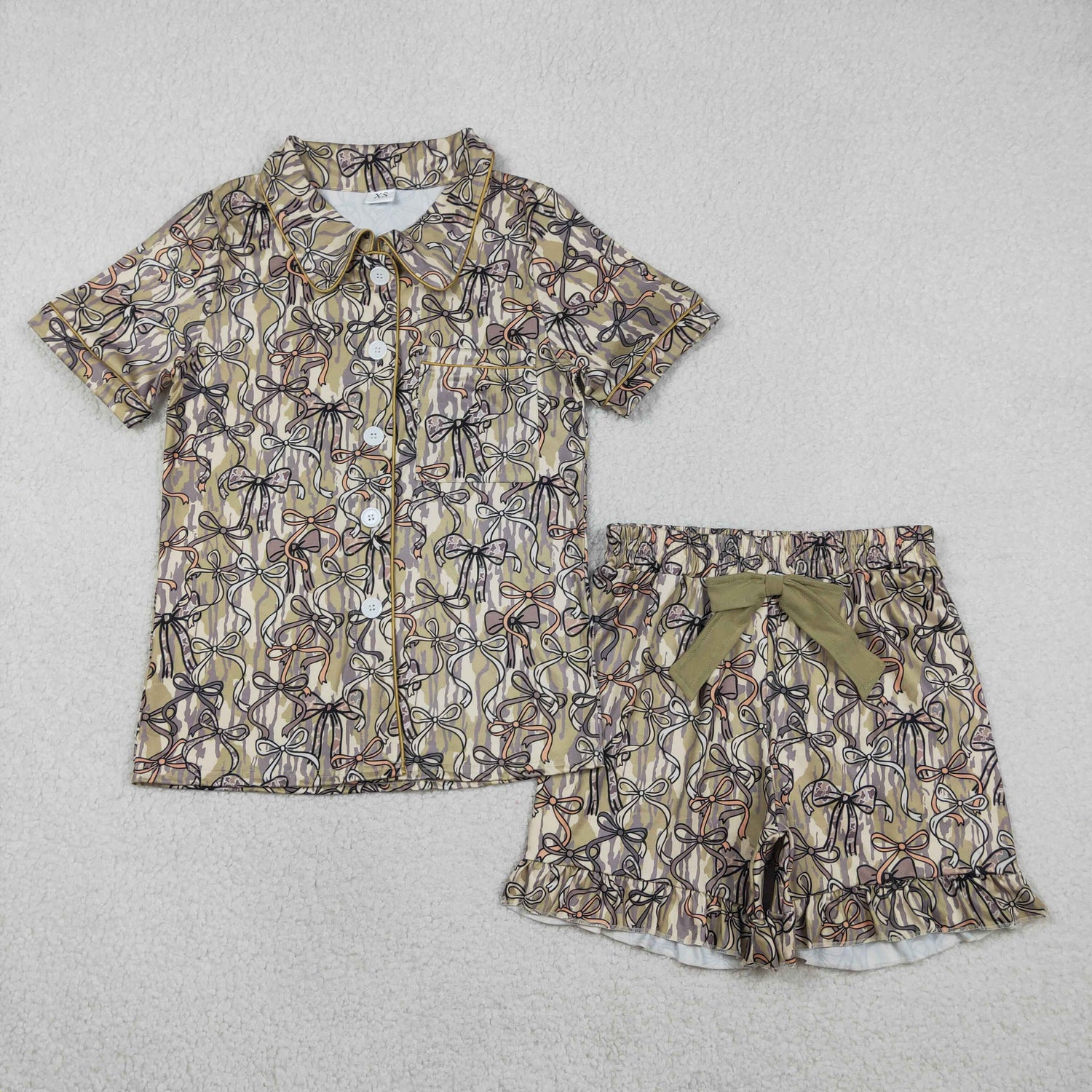 2.7 RTS NO MOQ (In stock)GSSO3126 Baby Girls Southern Olive Camo Bows Button Pocket Top Ruffle Shorts Pajamas Sets
