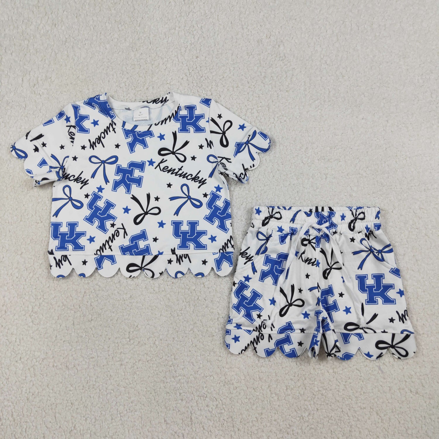 3.24 RTS NO MOQ (In stock)GSSO3255 Kids Clothing for Baby Girls Short Sleeve Blue Star Bows UK Top Scallop Shorts Team Clothes Sets