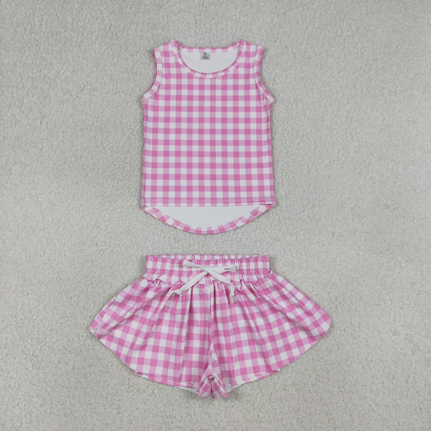 4.9 GSSO3478 RTS NO MOQ (In stock )Sleeveless pink plaid top shorts girls active wear set