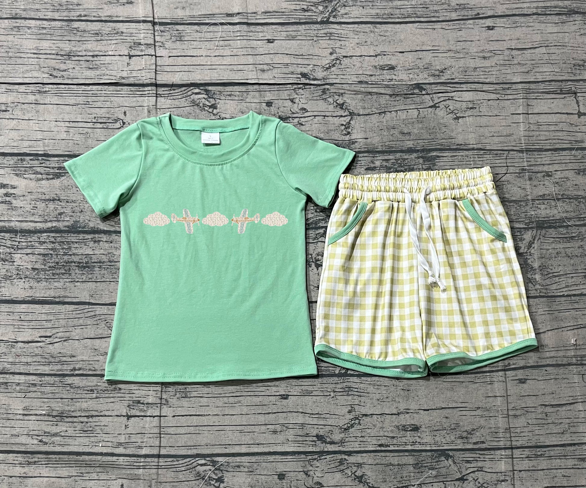 1.14 BSSO1684 Sample No Moq Embroidery Air Planes Baby Boys Top Checked Pockets Clothes Sets