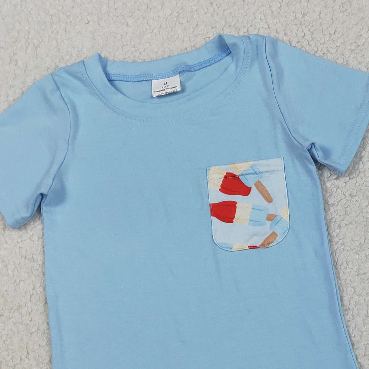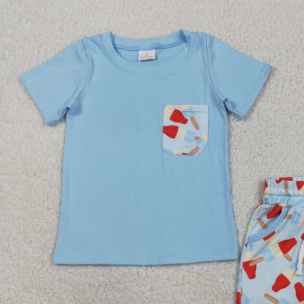 1.22 RTS NO MOQ (In stock)BSSO1844 Baby Boys Blue Shirt Top Popsicle Pockets Shorts 4th of July Clothes Sets