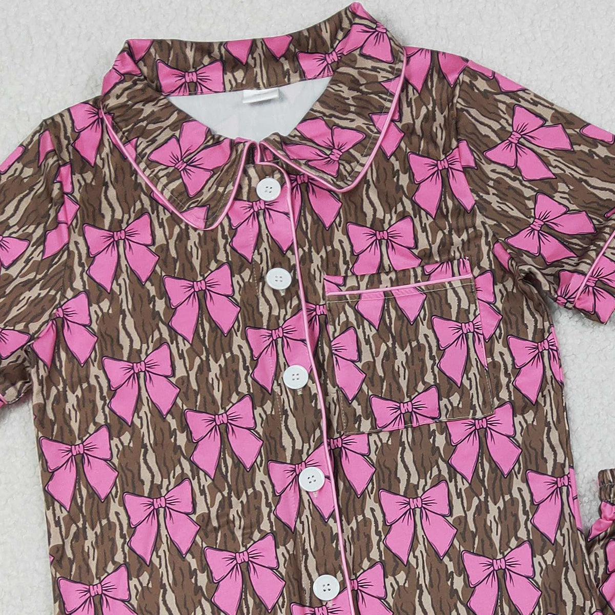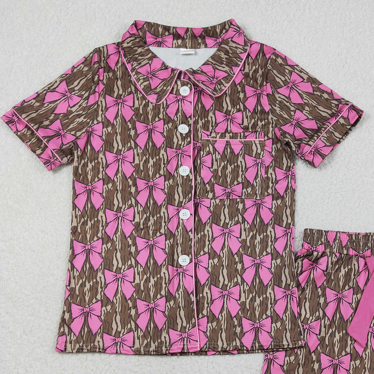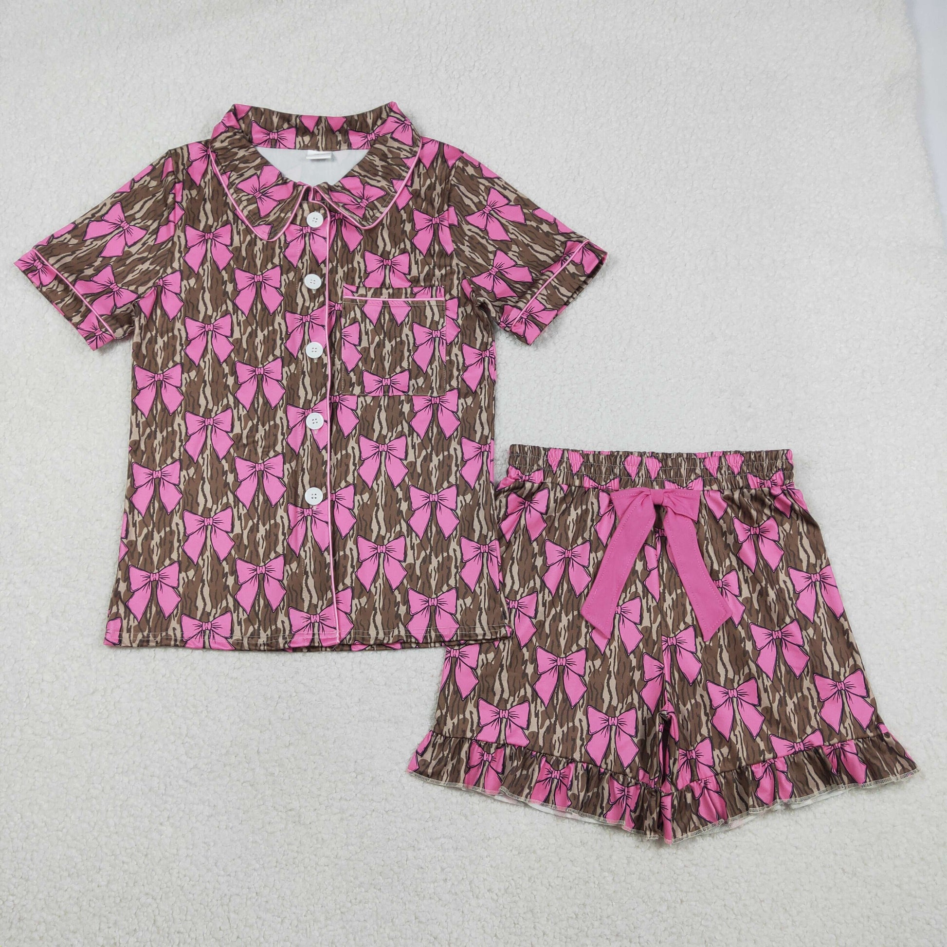 1.31 RTS NO MOQ (In stock)GSSO3137 Adult Women Southern Olive Camo Bows Button Pocket Top Ruffle Shorts Pajamas Set
