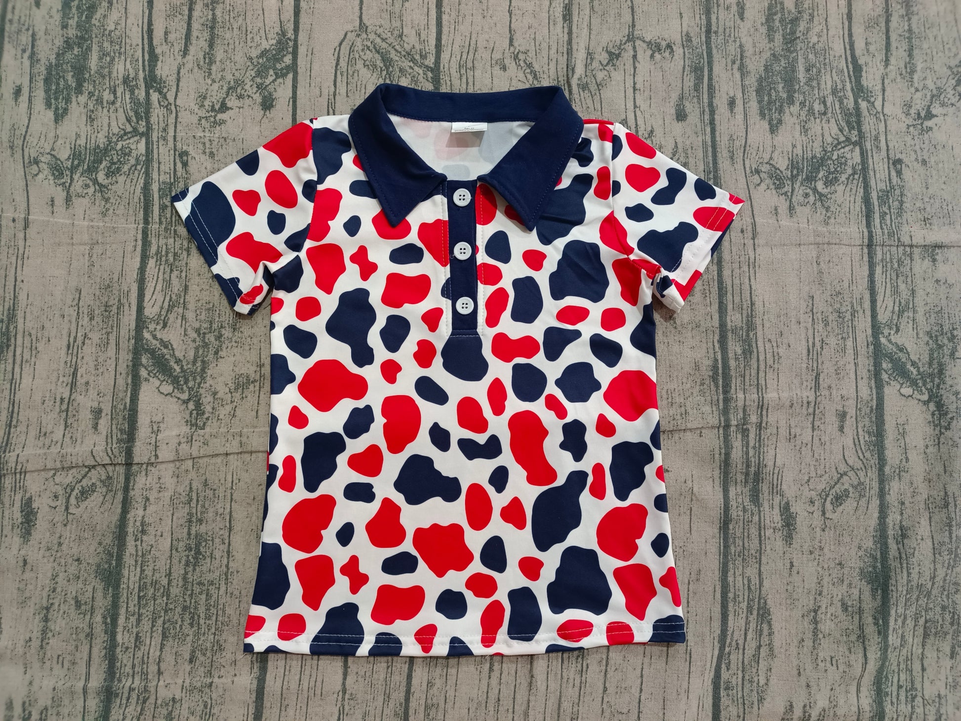 1.5 BT1657 Sample No Moq Baby Boys Red Blue Cow Print Button 4th of July Polo Shirts Top