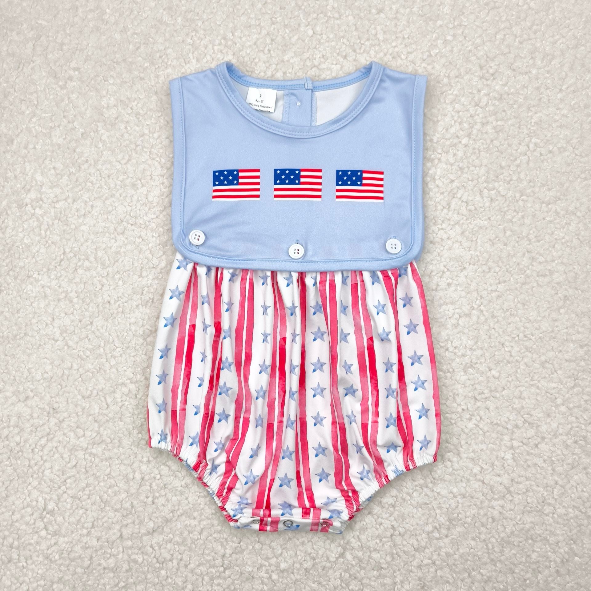 1.5 RTS NO MOQ (In stock)SR3049 4th of July Baby Boys Sleeveless Flags Red Stripe Stars 4th Of July Rompers