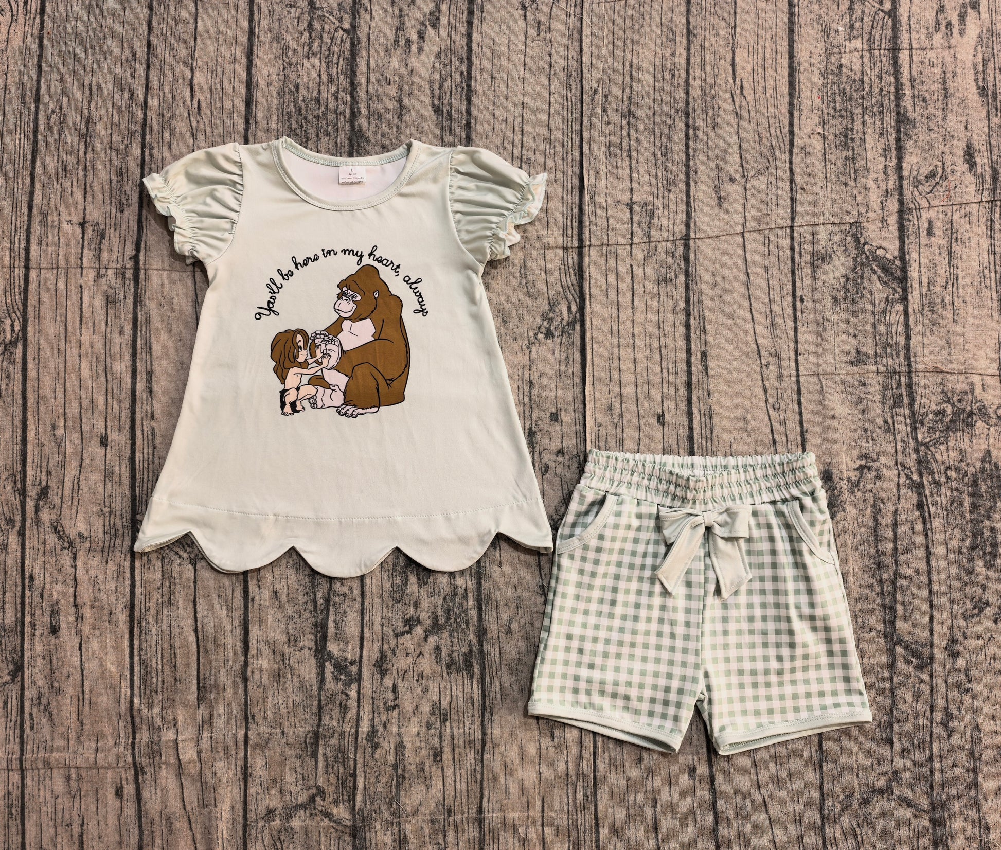 1.7 GSSO2906 Sample No Moq Baby Girls Monkeys Tunic Green Checked Pockets Shorts Clothes Sets