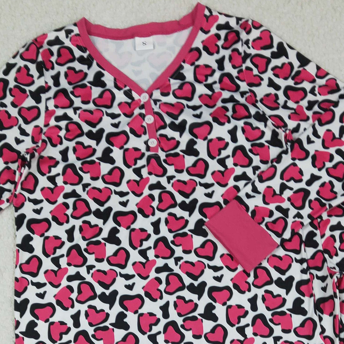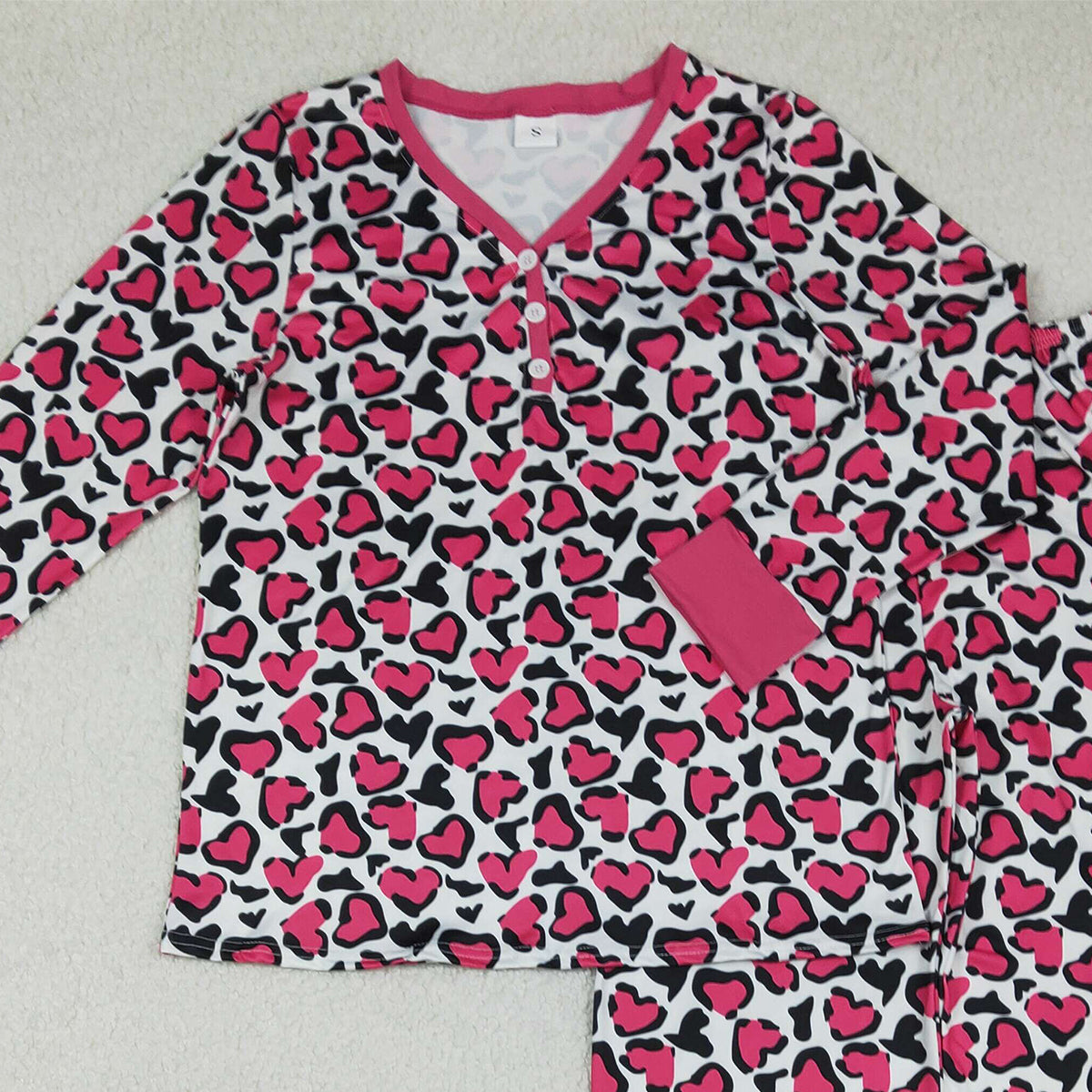 1.7 RTS NO MOQ (In stock)GLP2826 Adult Women Pink Black Hearts Leopard Pants Valentines Pajamas Sets