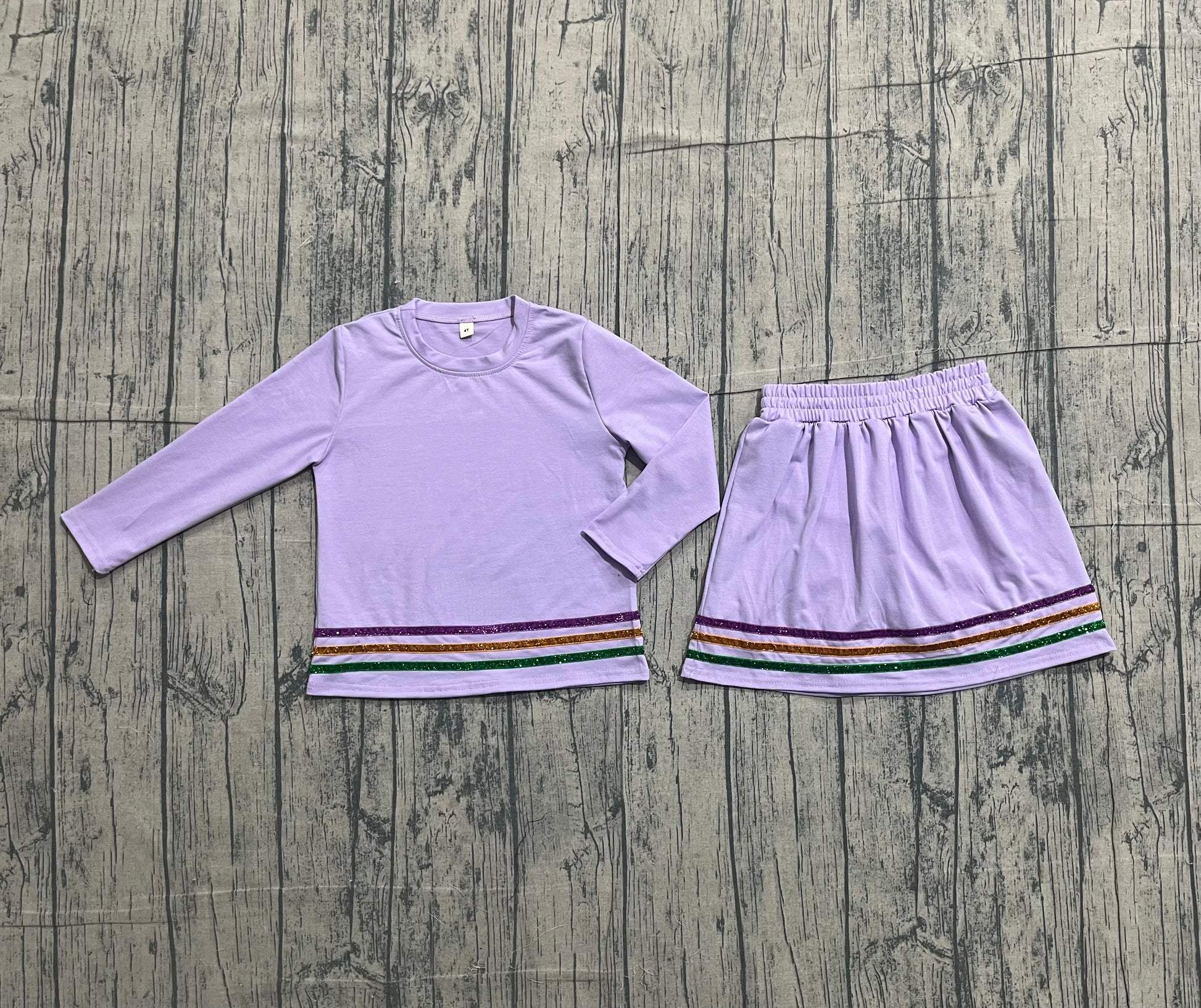 1.8 GLD1573 Smple No Moq Baby Girls Purple Long Sleeve Mardigras Stripe Top Skirt Short Clothes Sets
