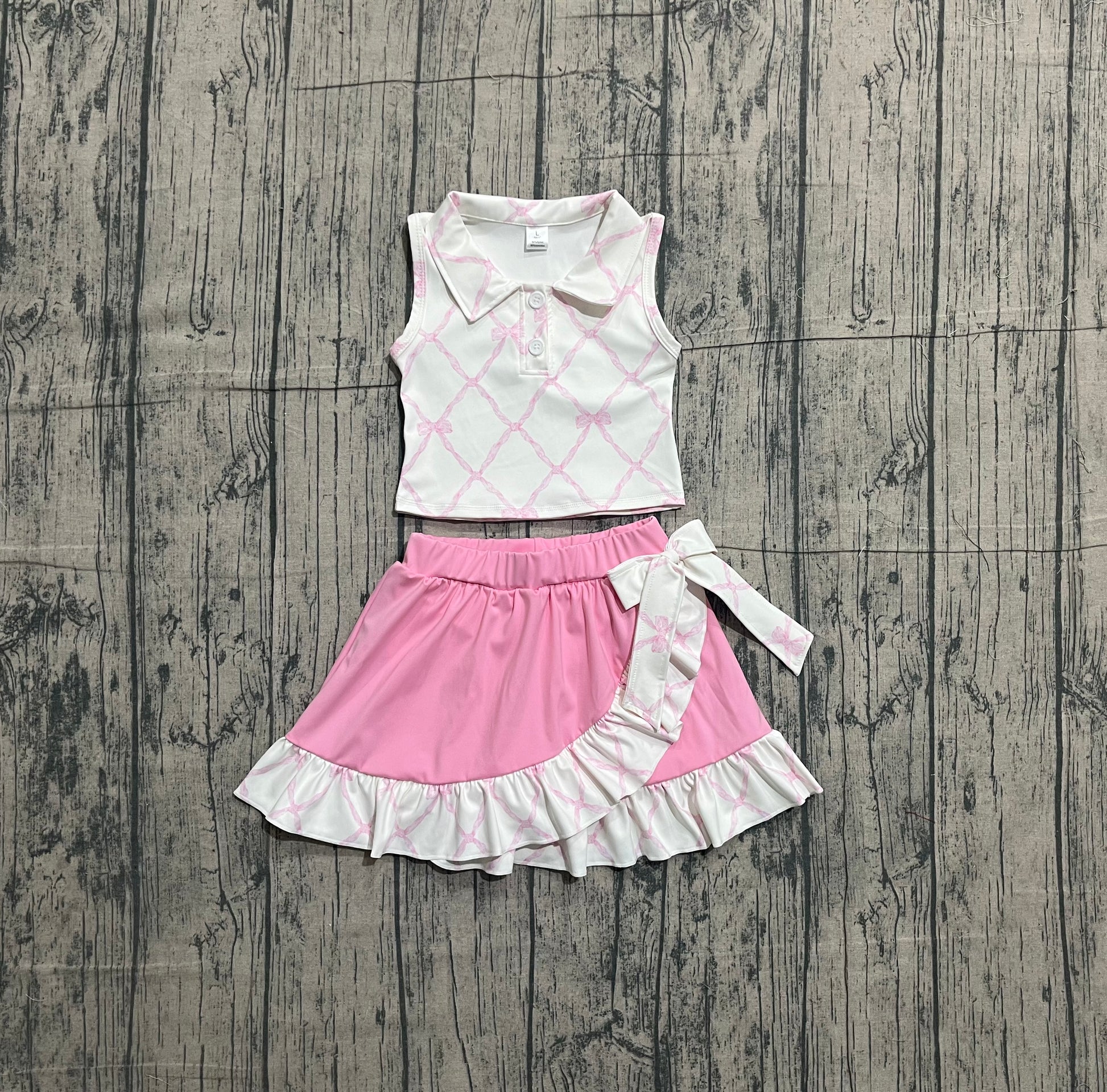 1.8 GSD3479 Sample No Moq Yoga fabric Baby Girls Pink Bows Checked Button Top Ruffle Skirt Shorts Yoga Clothes Sets