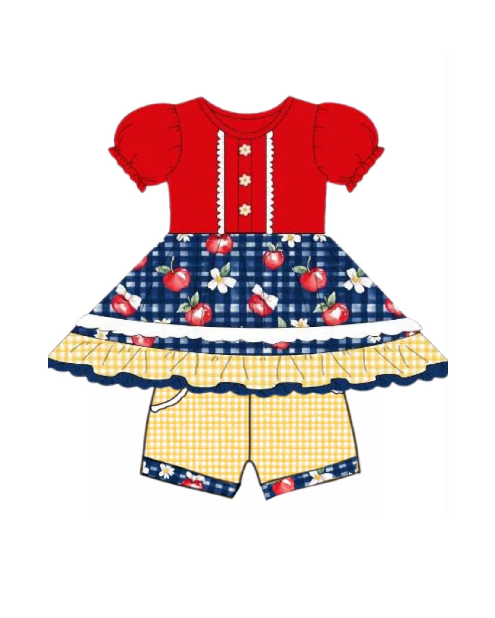 1.9 GSSO3156 Pre order No Moq Baby Girls Bows Apples Tunic Pockets Shorts Back to School Clothes Sets