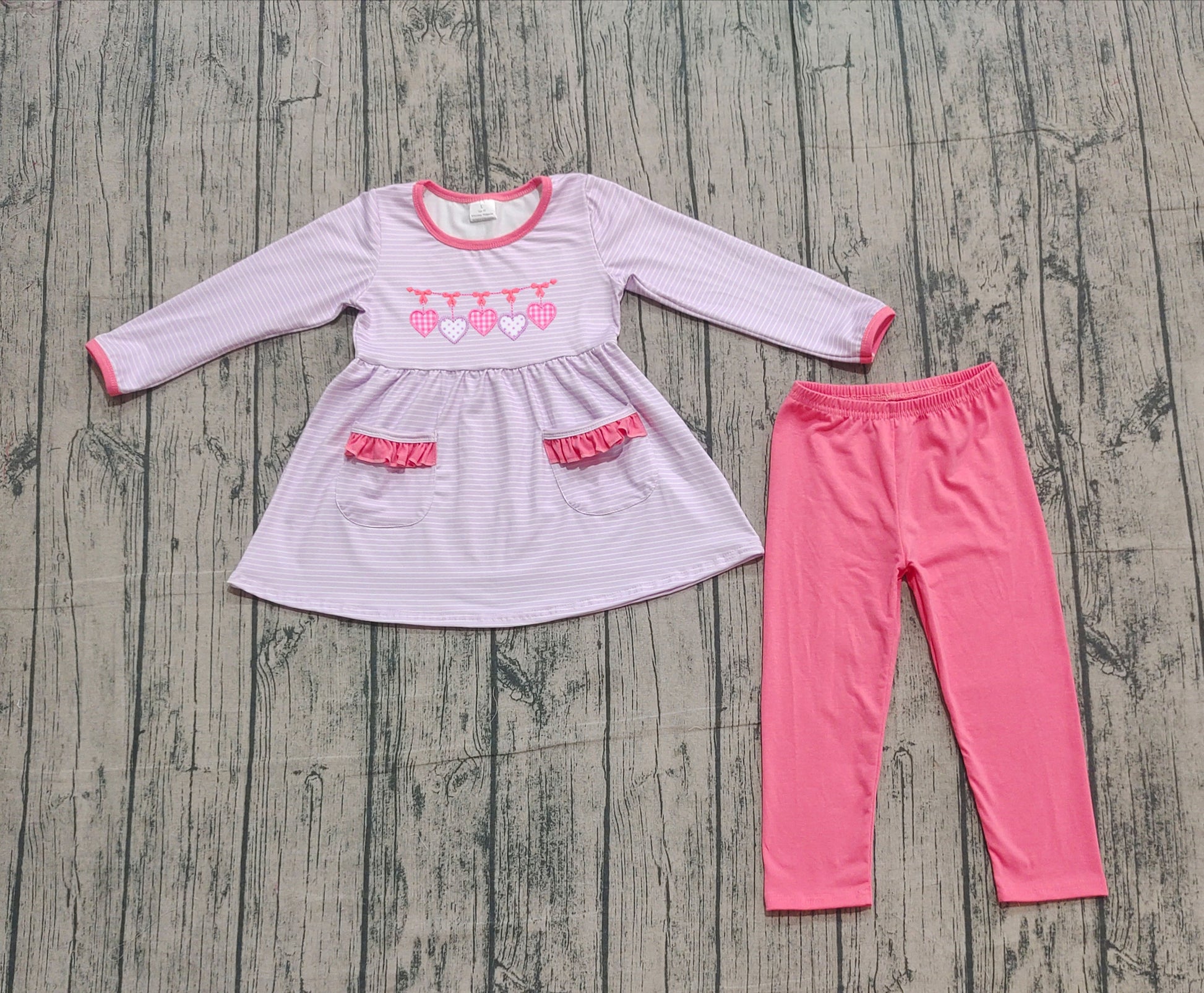 10.1 GLP2906 Sample No Moq Embroidery Hearts Baby Girls Stripe Pockets Tunic Leggings Valentine Clothes Sets