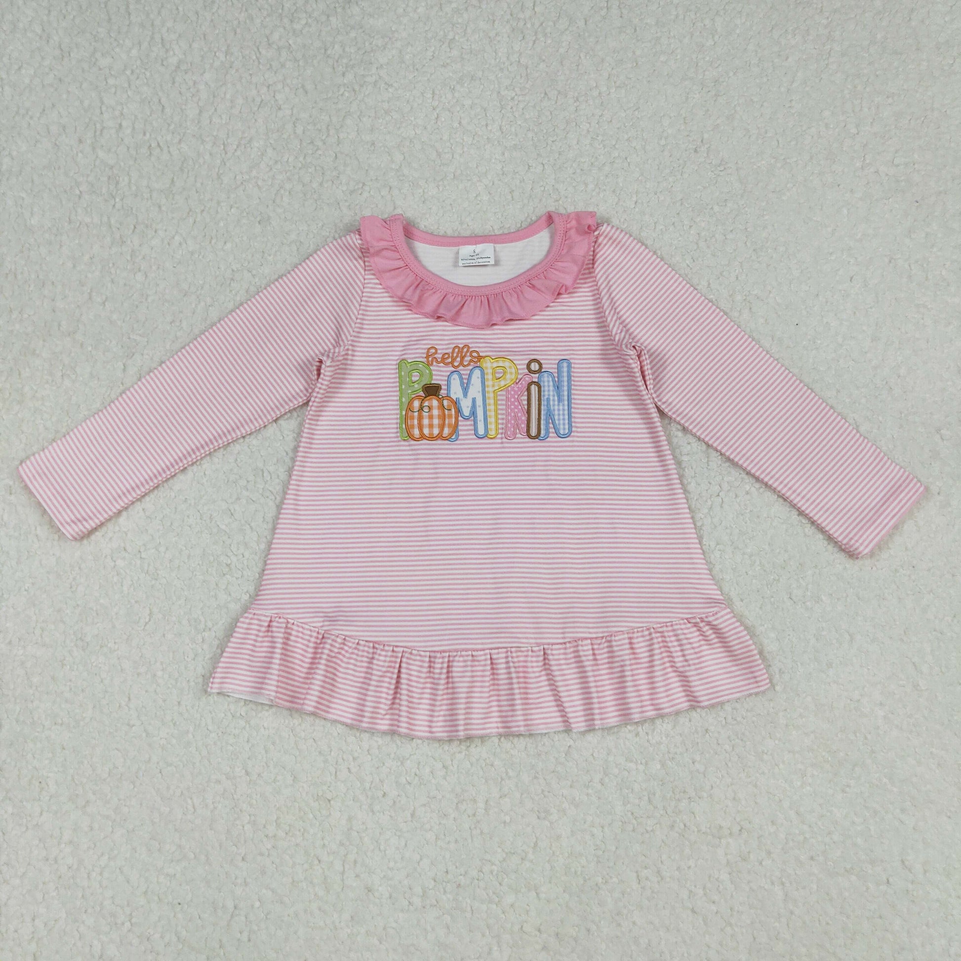 10.1 RTS NO MOQ (In stock)GT1183 Baby Girls Long Sleeve Tops Embroidery Pumpkins Baby Girls Pink Stripe Fall Tee Shirts Top