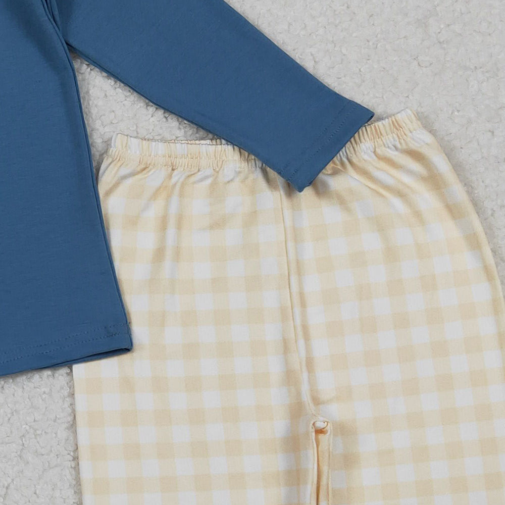 10.13 RTS NO MOQ (In stock)BLP1176 Baby Boys Winter Outfits Embroidery Turkey Pumpkins Baby Boys Plaid Pant Thanksgiving Clothes Set