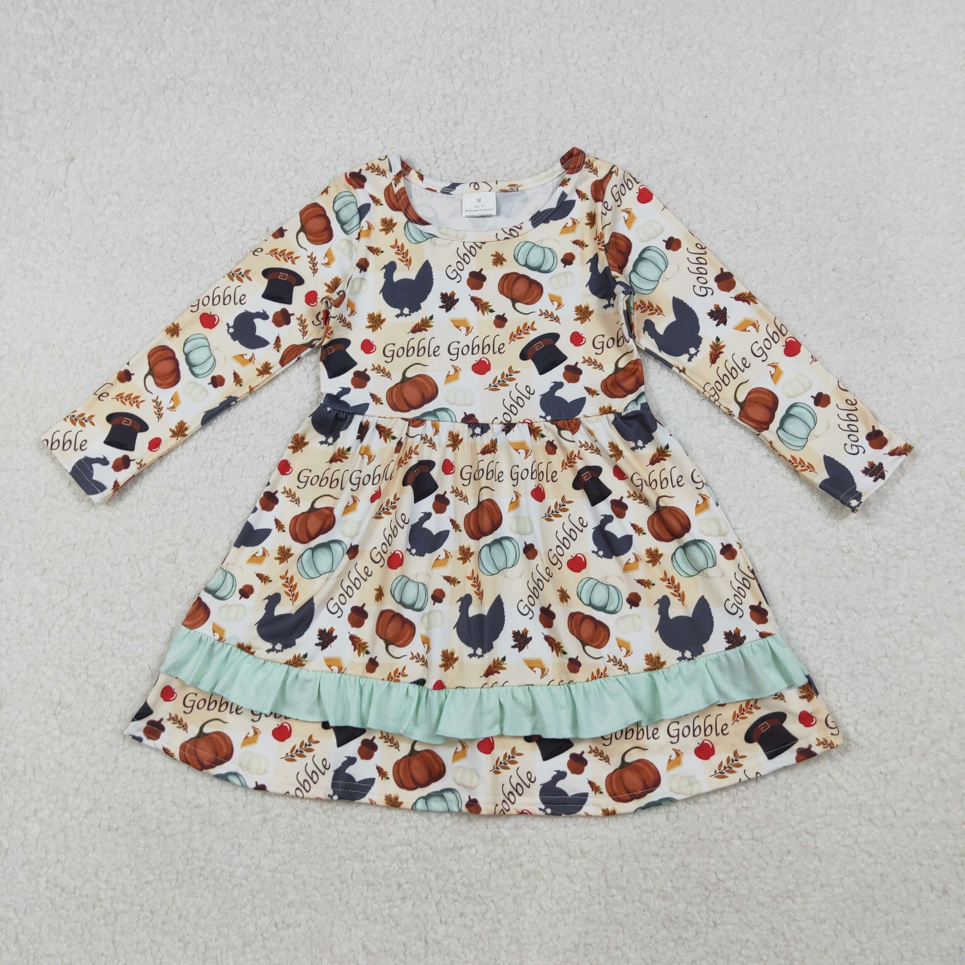 10.14 RTS NO MOQ (In stock)GLD0789 Baby Girls Winter Dress Baby Girls Thanksgiving Turkey Pumpkins Ruffle Knee Length Dresses