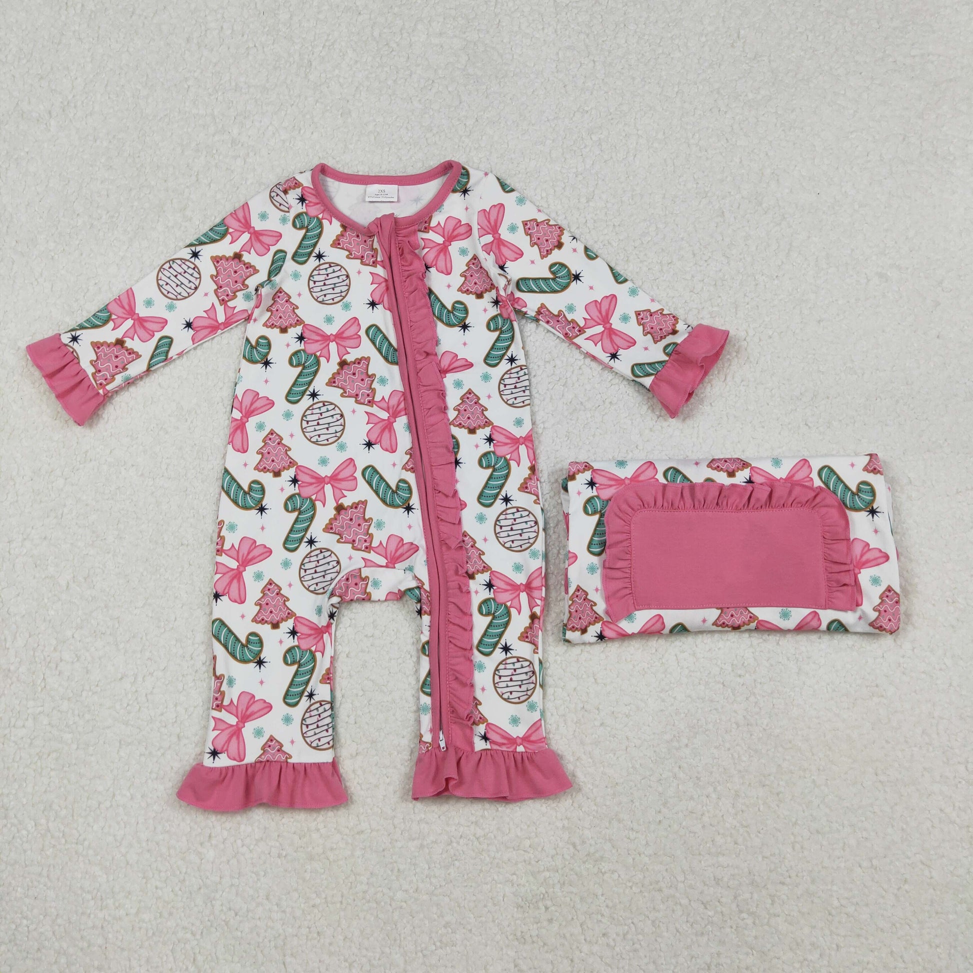 10.18 RTS NO MOQ (In stock)LR2486 Baby Girls Winter Rompers Baby Girls Candy Cane Trees Christmas Ruffle Zipper Footie Rompers