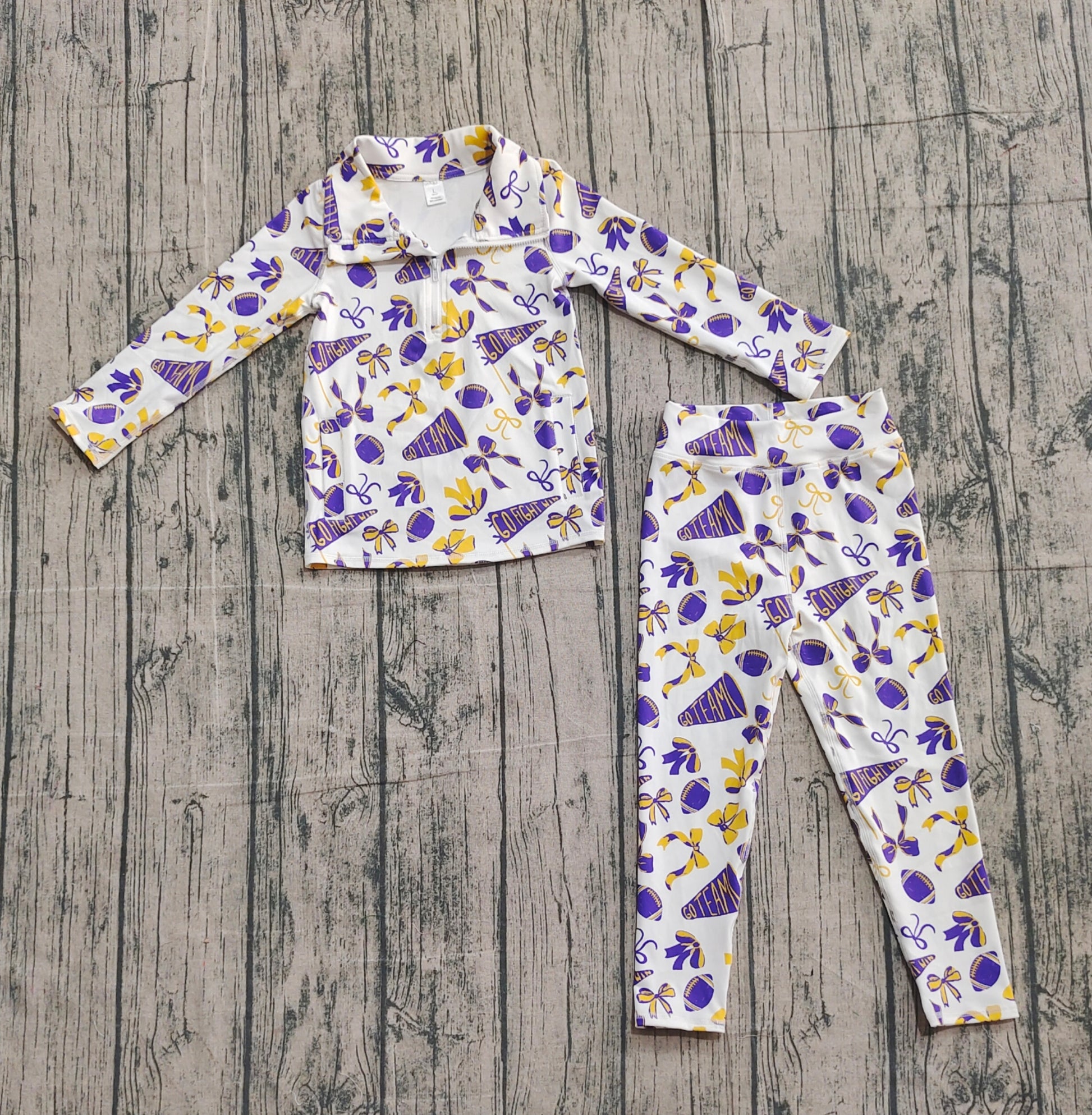 10.2 GLP2762 Sample No Moq Yoga fabric Baby Girls Purple Bows Footballs Go Teams Pullovers Leggings Yoga Clothes Set