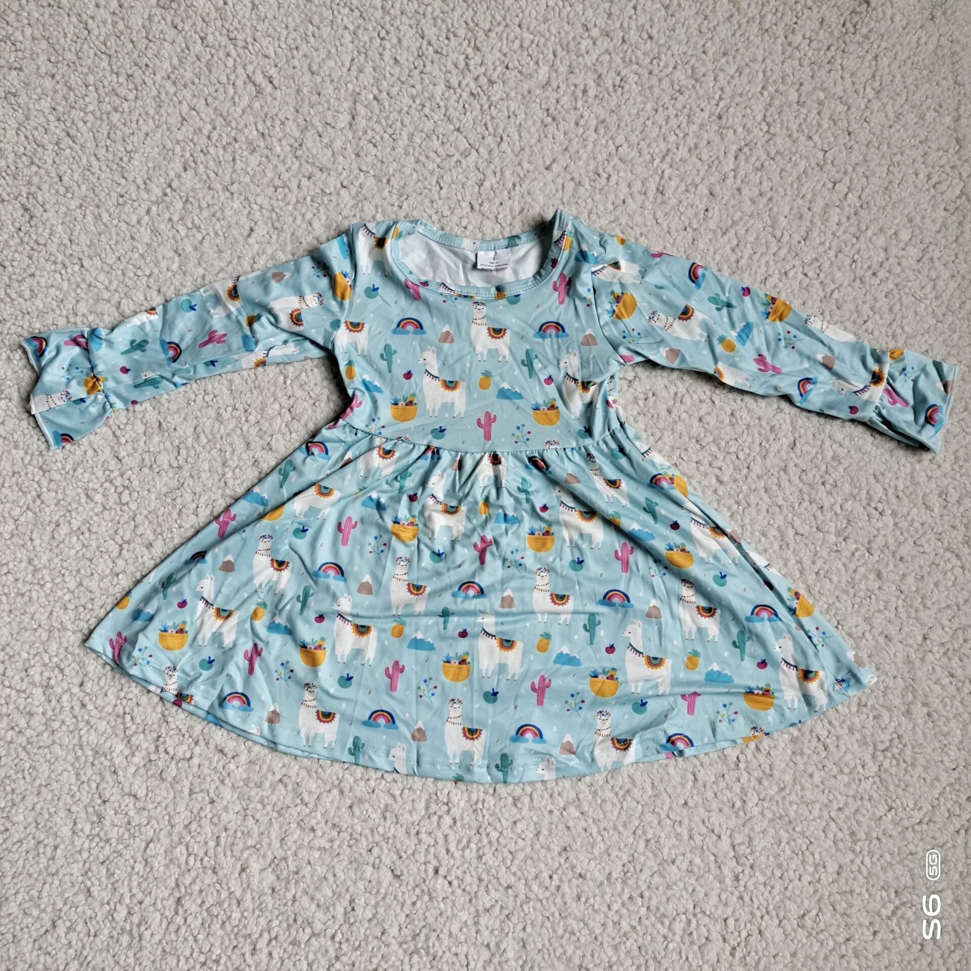 10.2 RTS NO MOQ(In stock)G4-12-4] Baby Girls Winter Dress Alpaca Rainbow Cactus Light Green Long Sleeve Dress