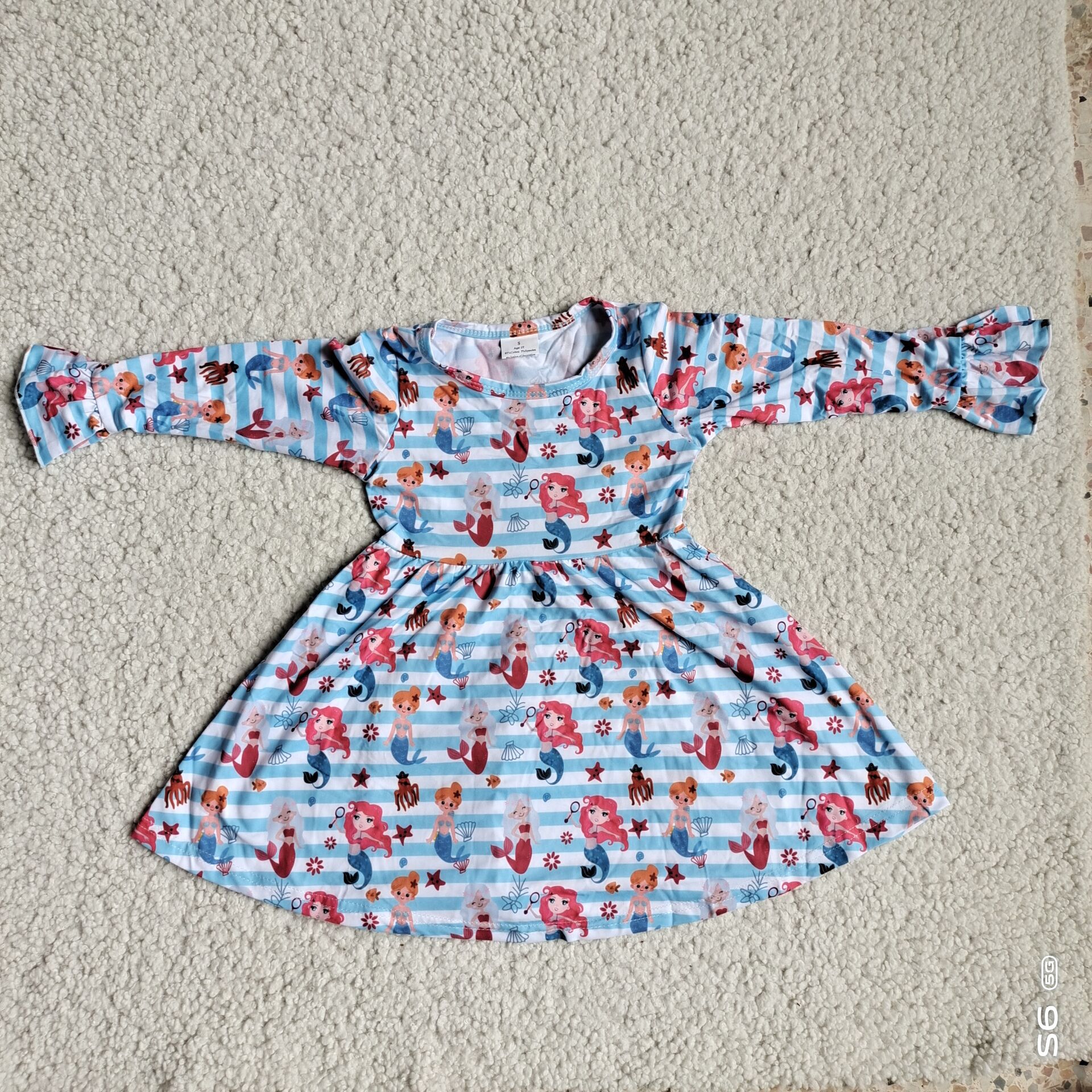 10.2 RTS NO MOQ(In stock)G4-12-8- Baby Girls Winter Dress Mermaid Starfish Blue and White Striped Long Sleeve Dress