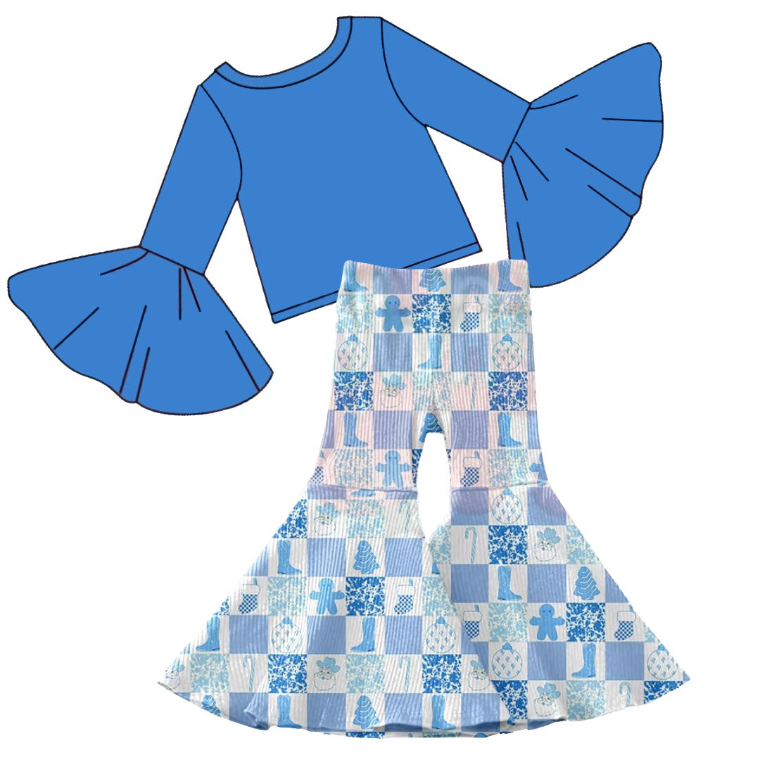 10.20 GLP3037 Pre order No Moq Baby Girls Blue Top Santa Gingerbread Bell Bottom Pant Christmas Clothes Set