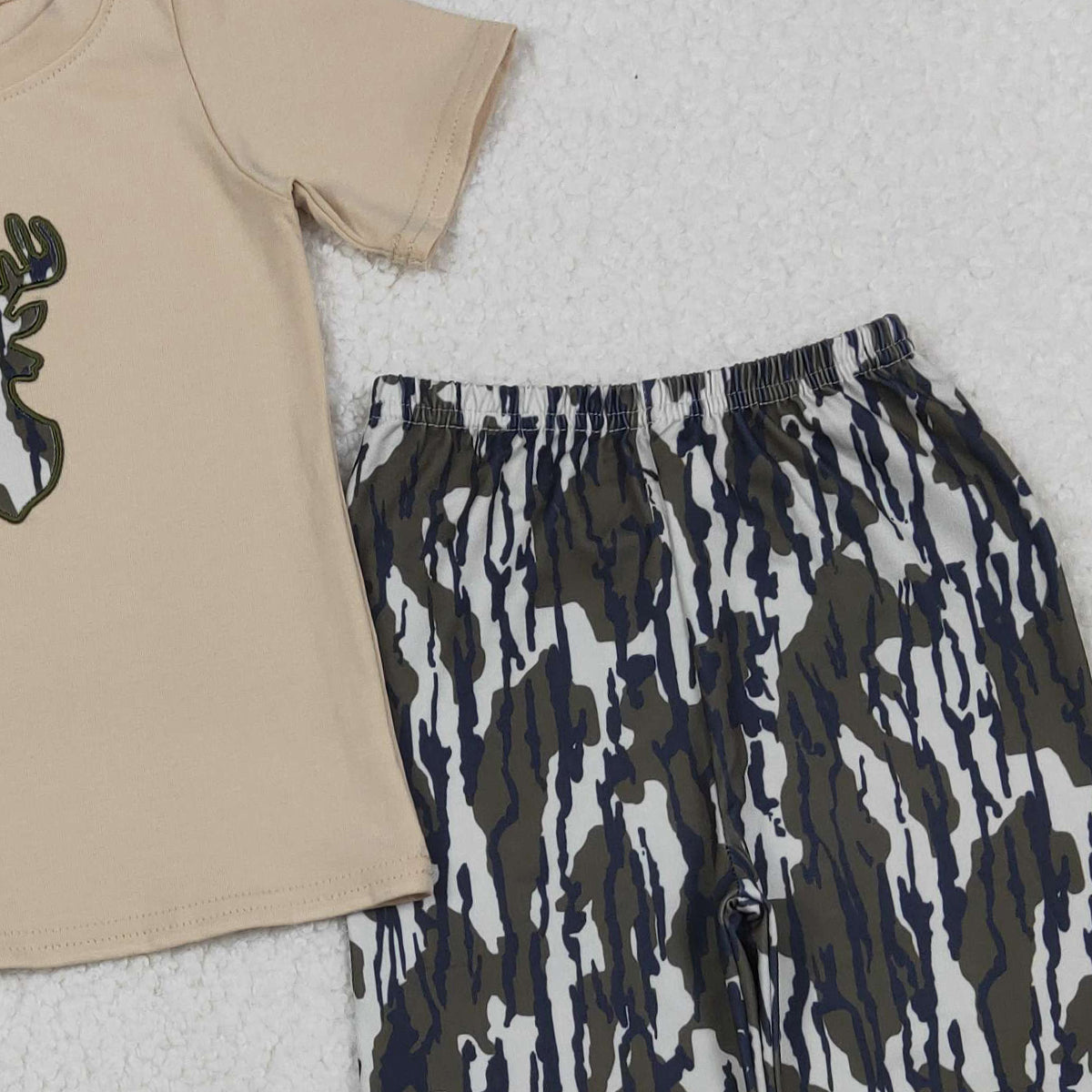 10.27 RTS NO MOQ (In stock)BSPO0582 Embroidery Camo Deer Baby Boys Top Flare Pant Hunting Set