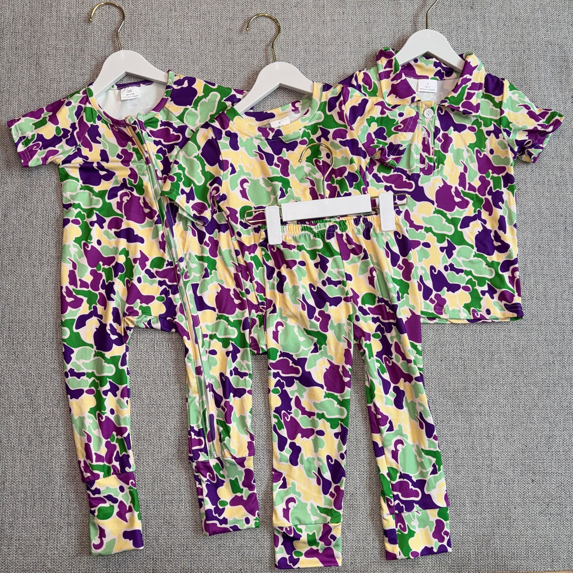 10.27 RTS Sibling Baby Boys Mardigras Camo Pant Pajamas Sets Two Way Zip Convertible Rompers Polo Shirts Top