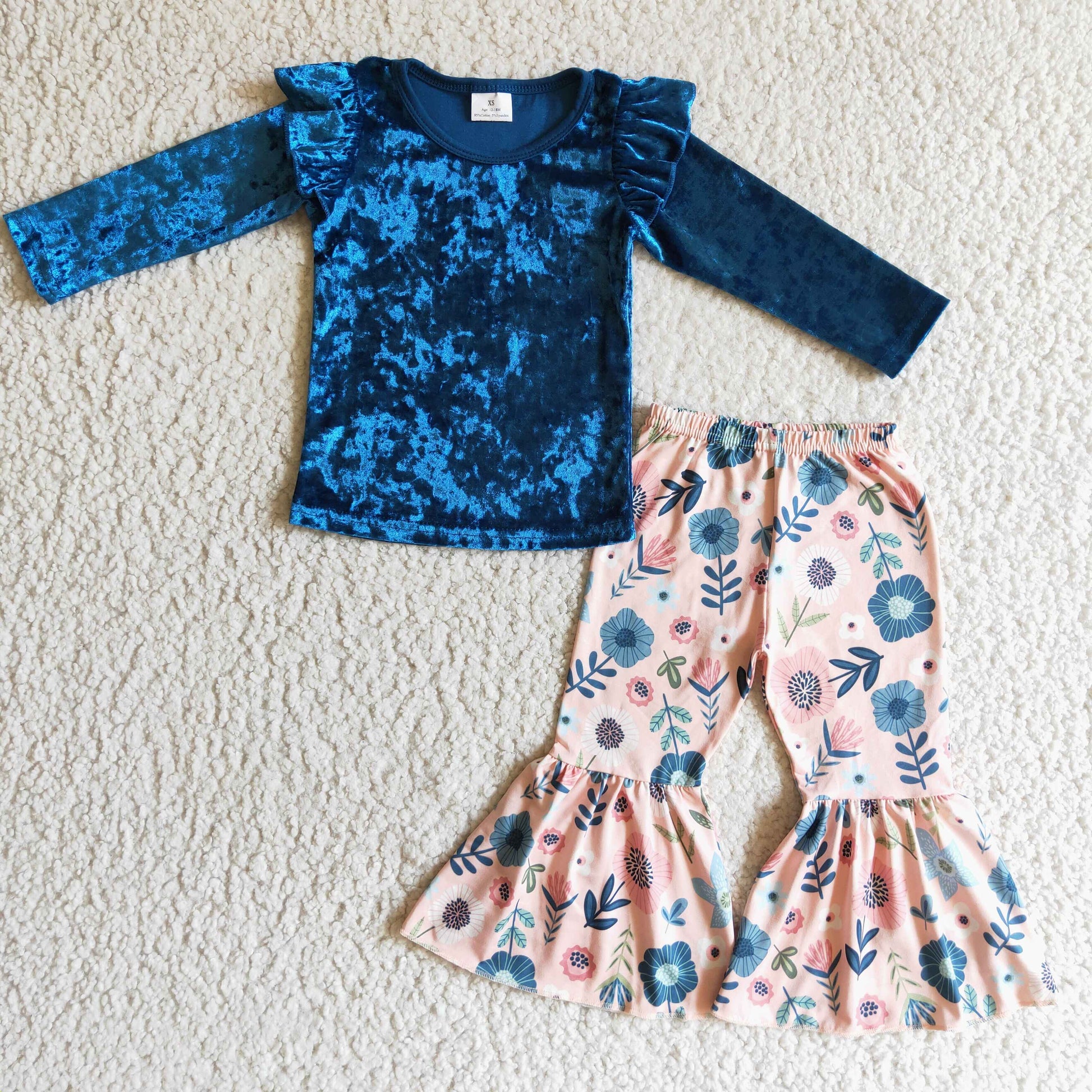 11.1 GLP0220 RTS No Moq Promotion Baby Girls fall blue velvet tops bell pants clothing sets