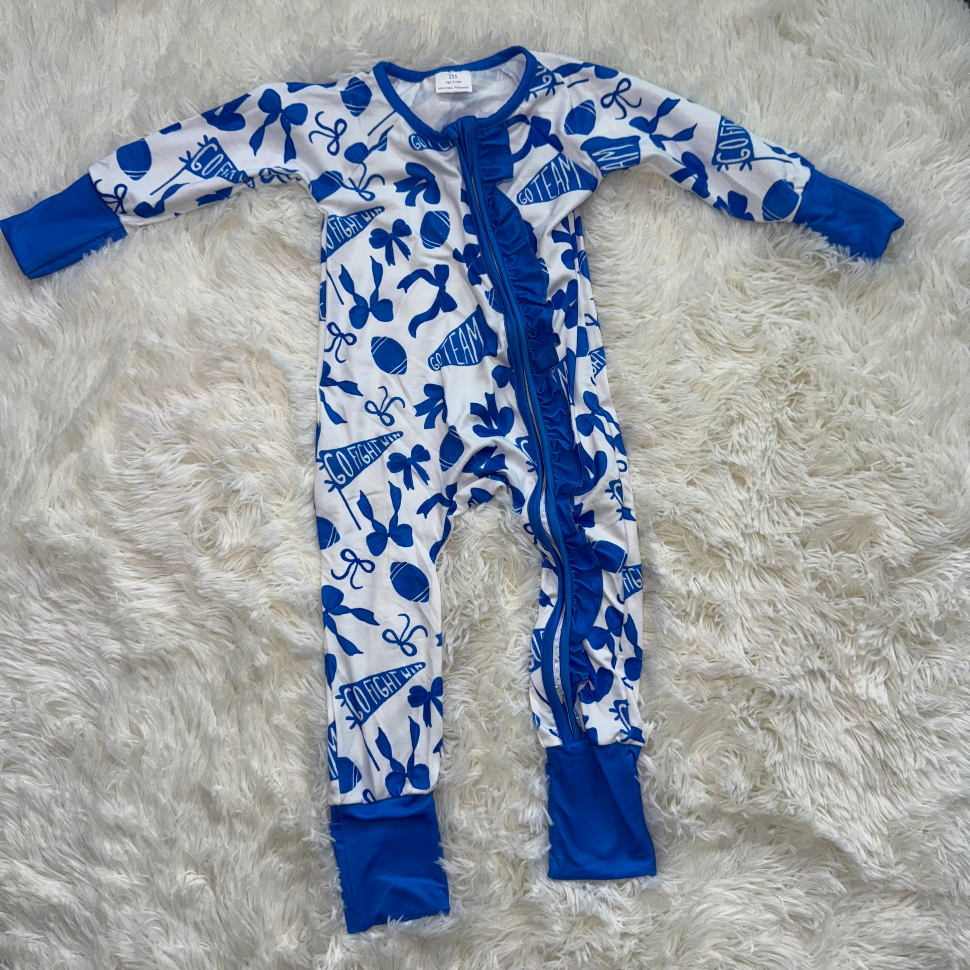 11.1 RST LR2511 Baby Girls Team Blue Bows Cheer Footballs Ruffle Zipper Footie Rompers