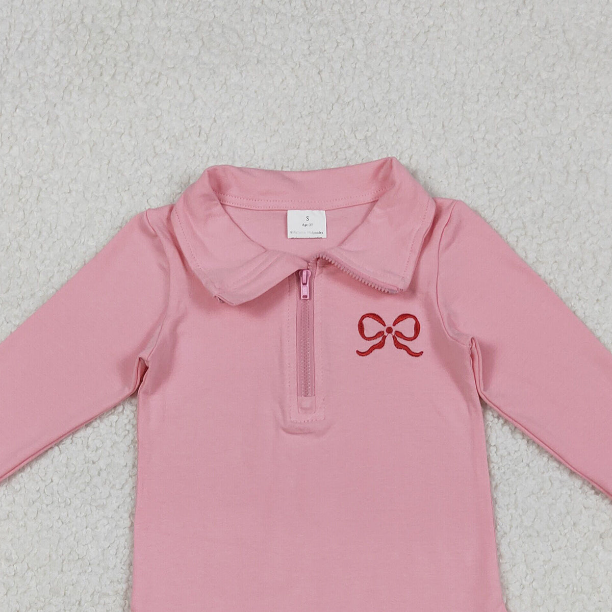 11.20 RTS NO MOQ (In stock)GT1270 Embroidery Bow Baby Girls Pink Long Ruffle Sleeve Zipper Valentines Pullovers Top