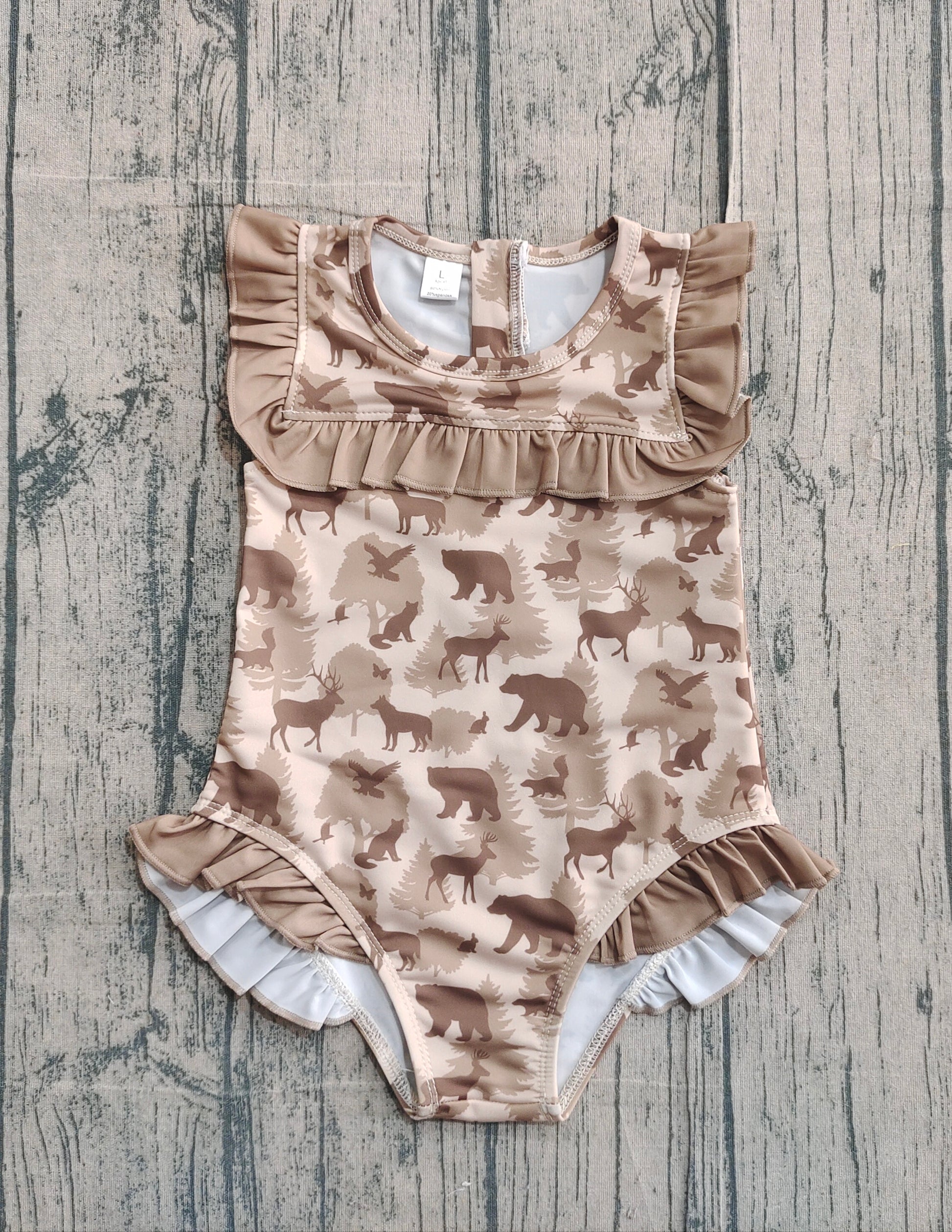 11.24 S0599 Sample No Moq Baby Girls Khaki Deer Bears Camo Ruffle Swimsuits