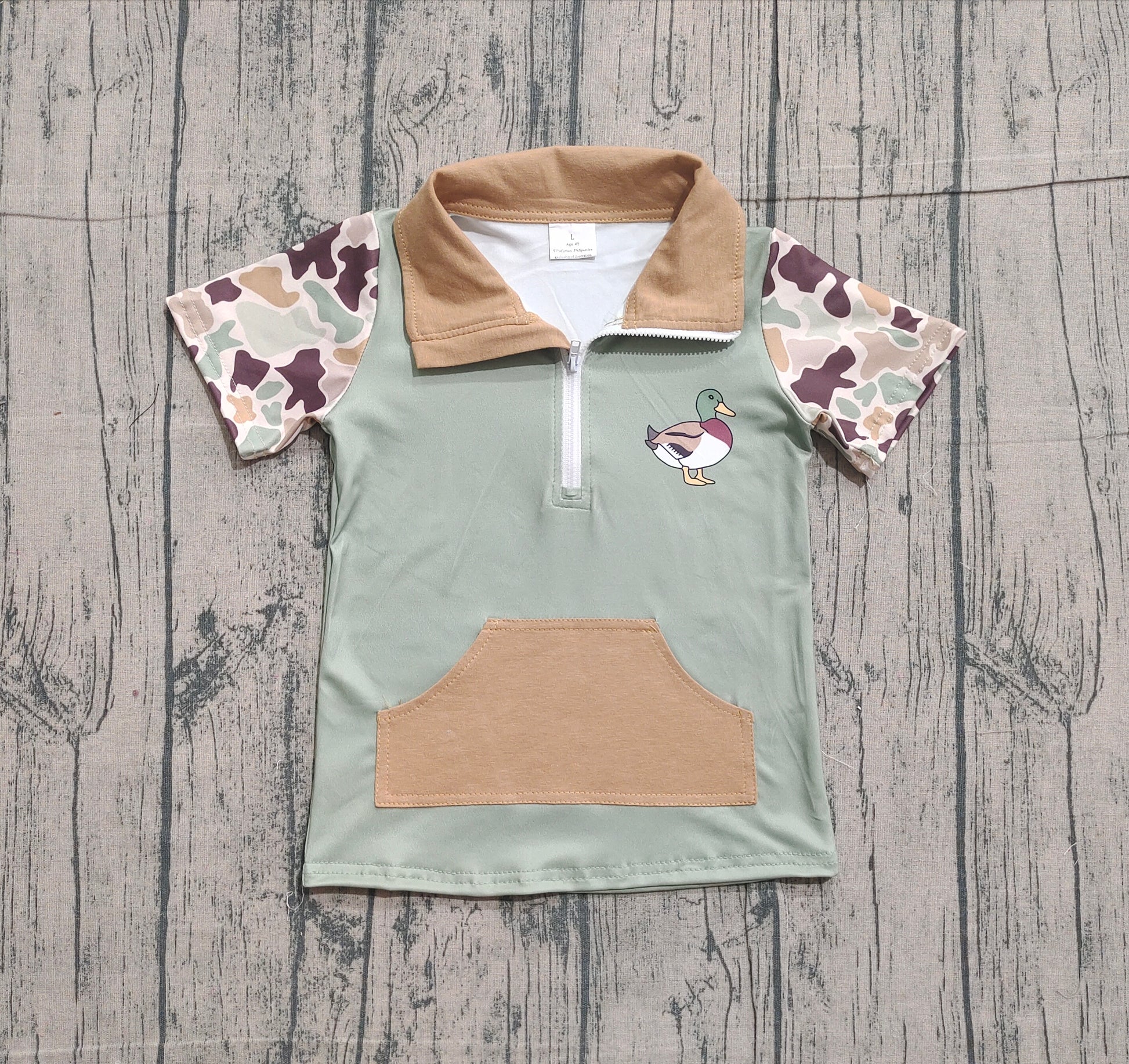 11.26 BT1530 Sample No Moq Baby Boys Green Camo Short Sleeve Ducks Zipper Pockets Hunting Pullovers Top