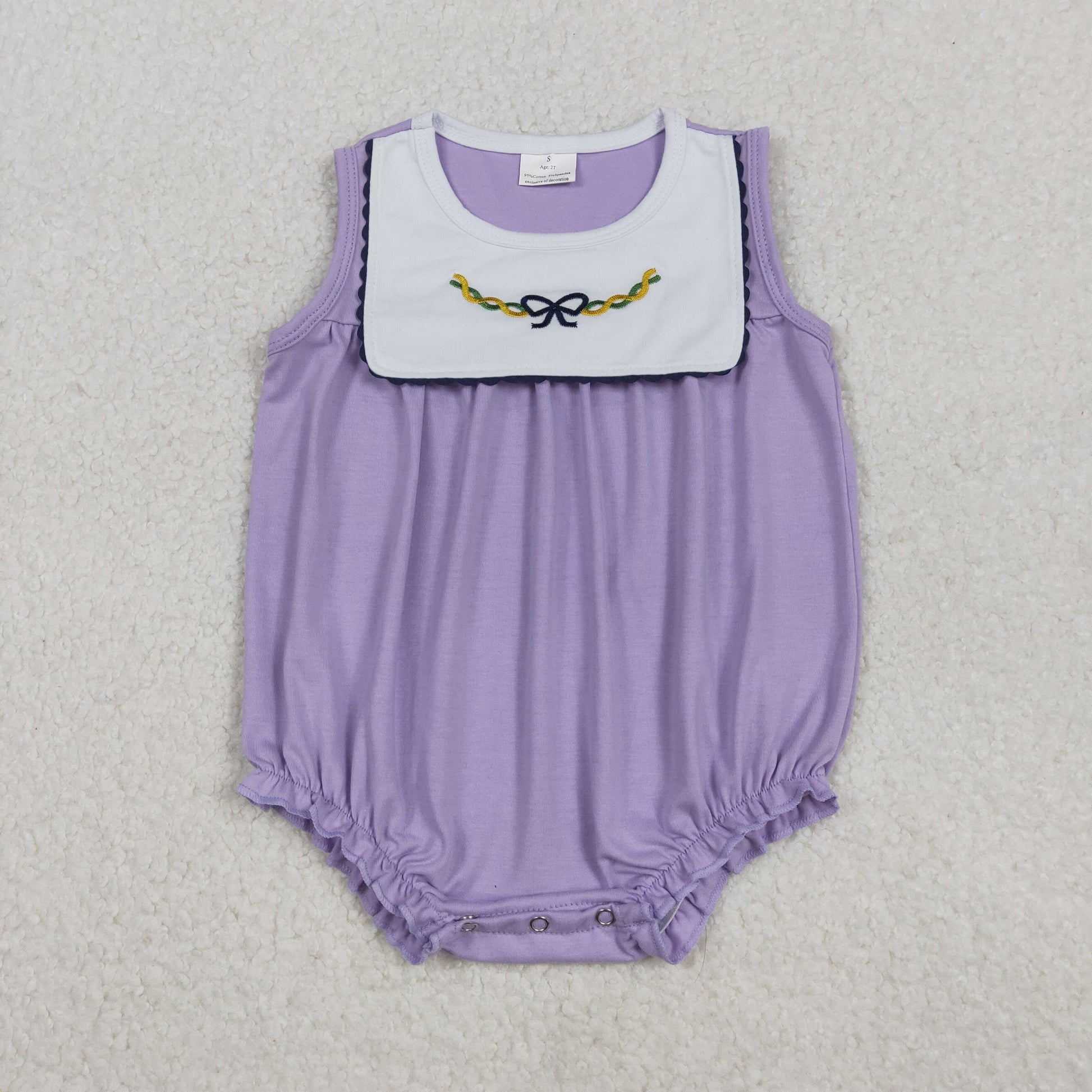 11.6 RTS NO MOQ (In stock)SR3235 Baby Girls Summer Rompers Embroidery Bows Baby Girls Sleeveless Mardigrass Ruffle Rompers