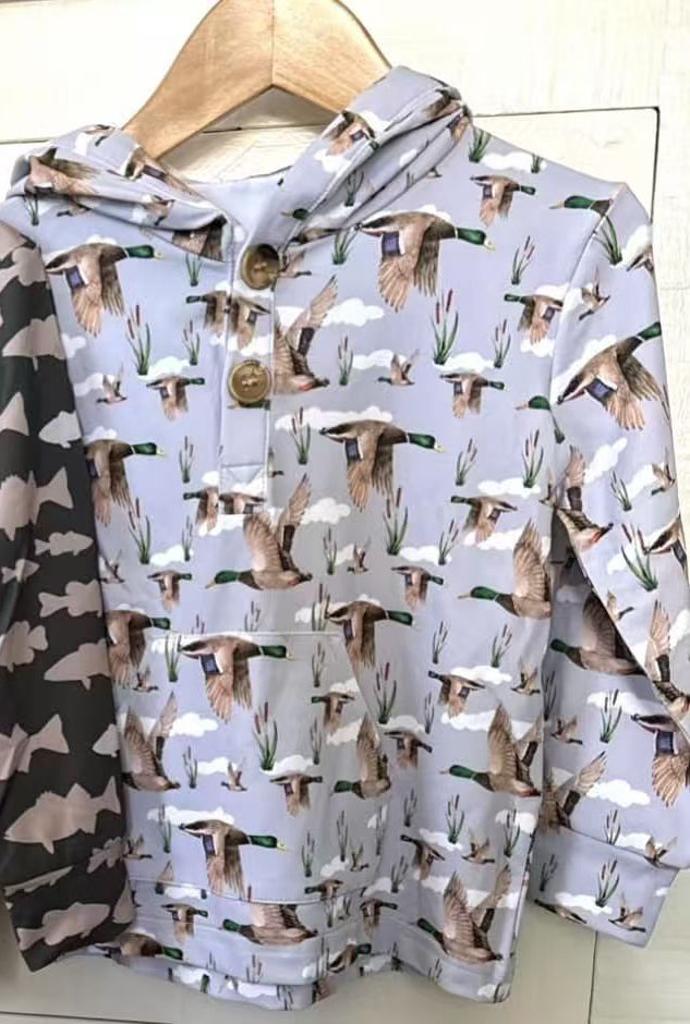 11.8 BT1546 Pre order No Moq Baby Boys Long Sleeve Ducks Button Pockets Hunting Hoodies Top