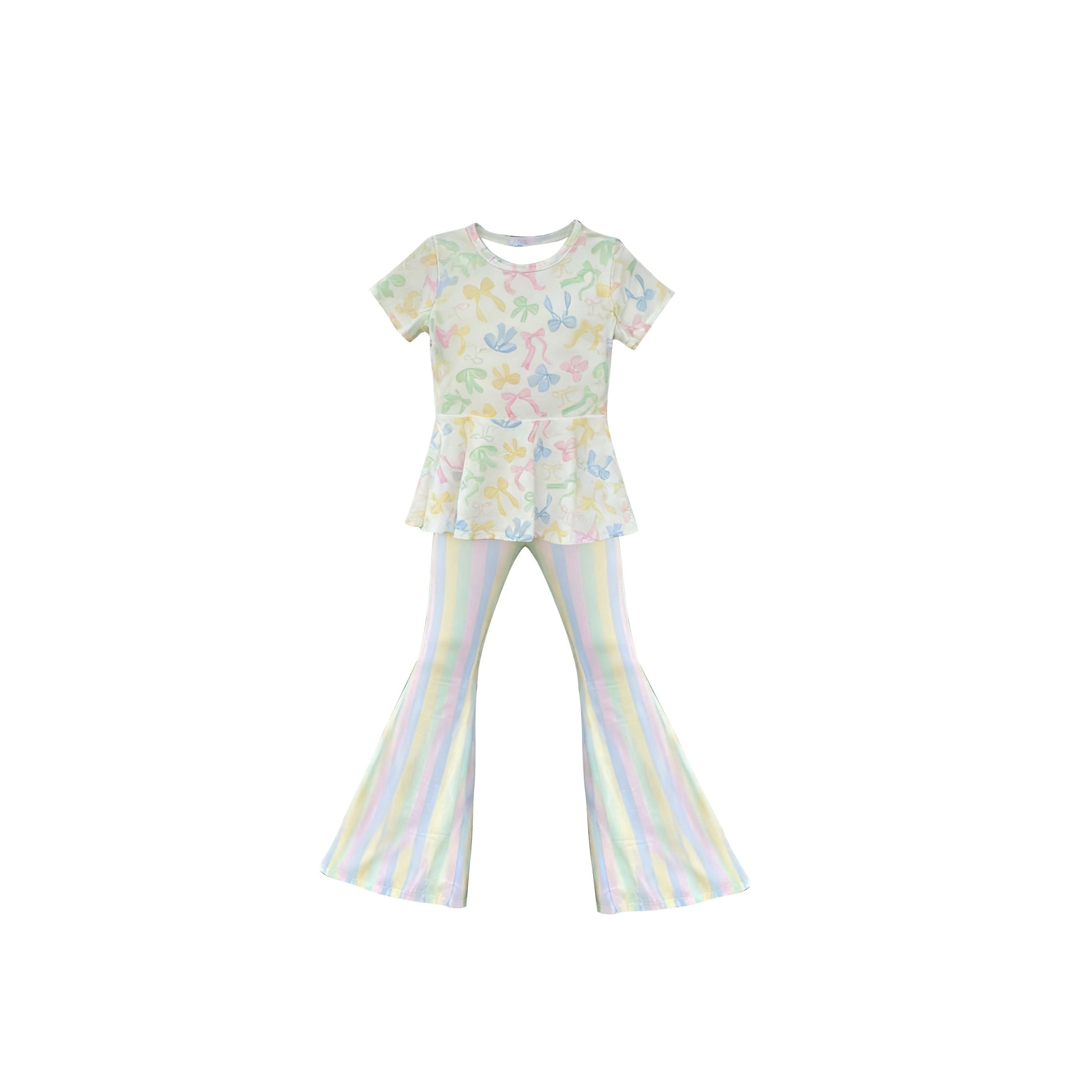 11.8 GSPO2196 Pre order No Moq Baby Girls Colorful Bows Tunic Stripes Bell Bottom Pants Clothes Sets