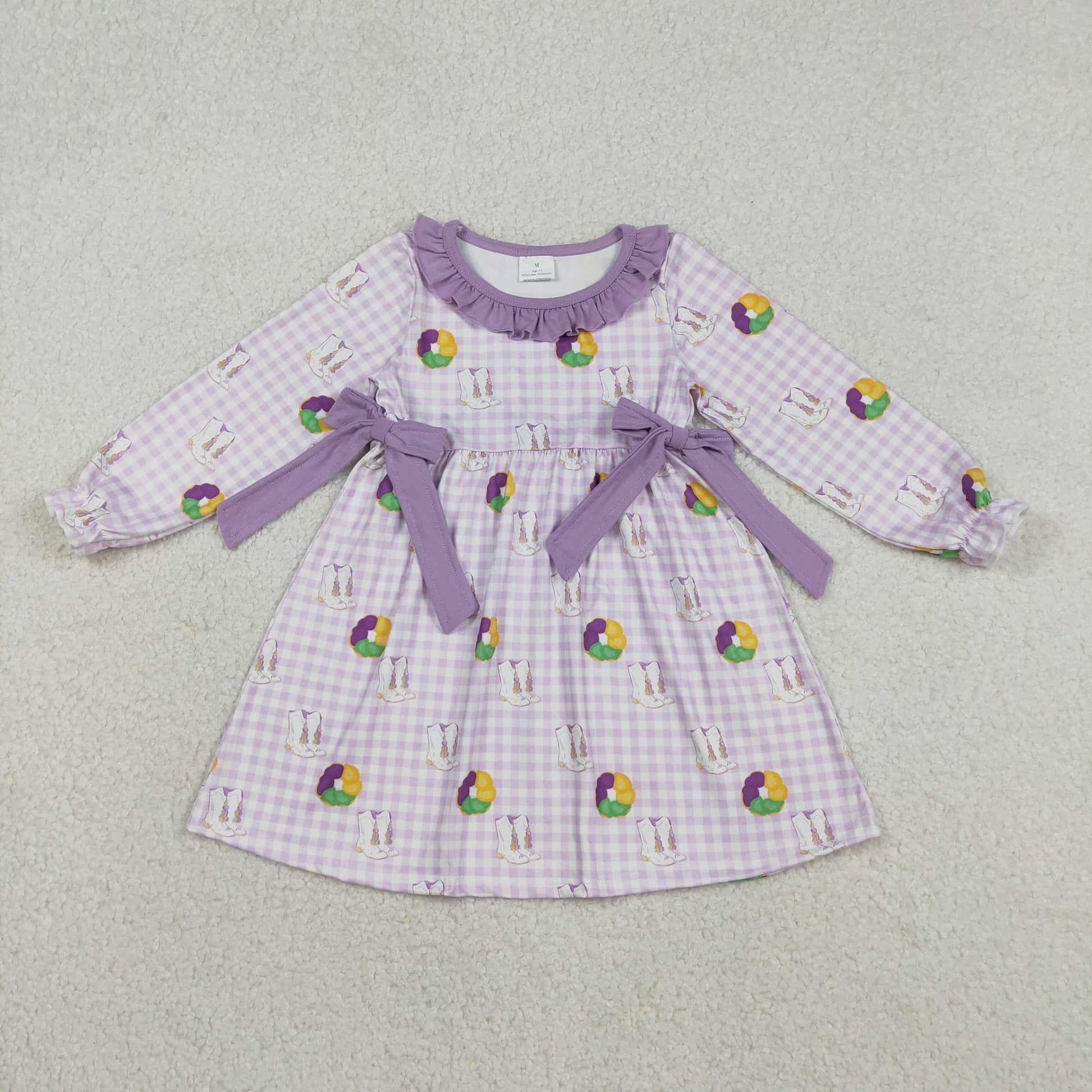 12.12 RTS NO MOQ (In stock)GLD1379 Baby Girls Winter Dress Baby Girls Purple Checked Boots Donuts Bows Mardigras Knee Length Dresses