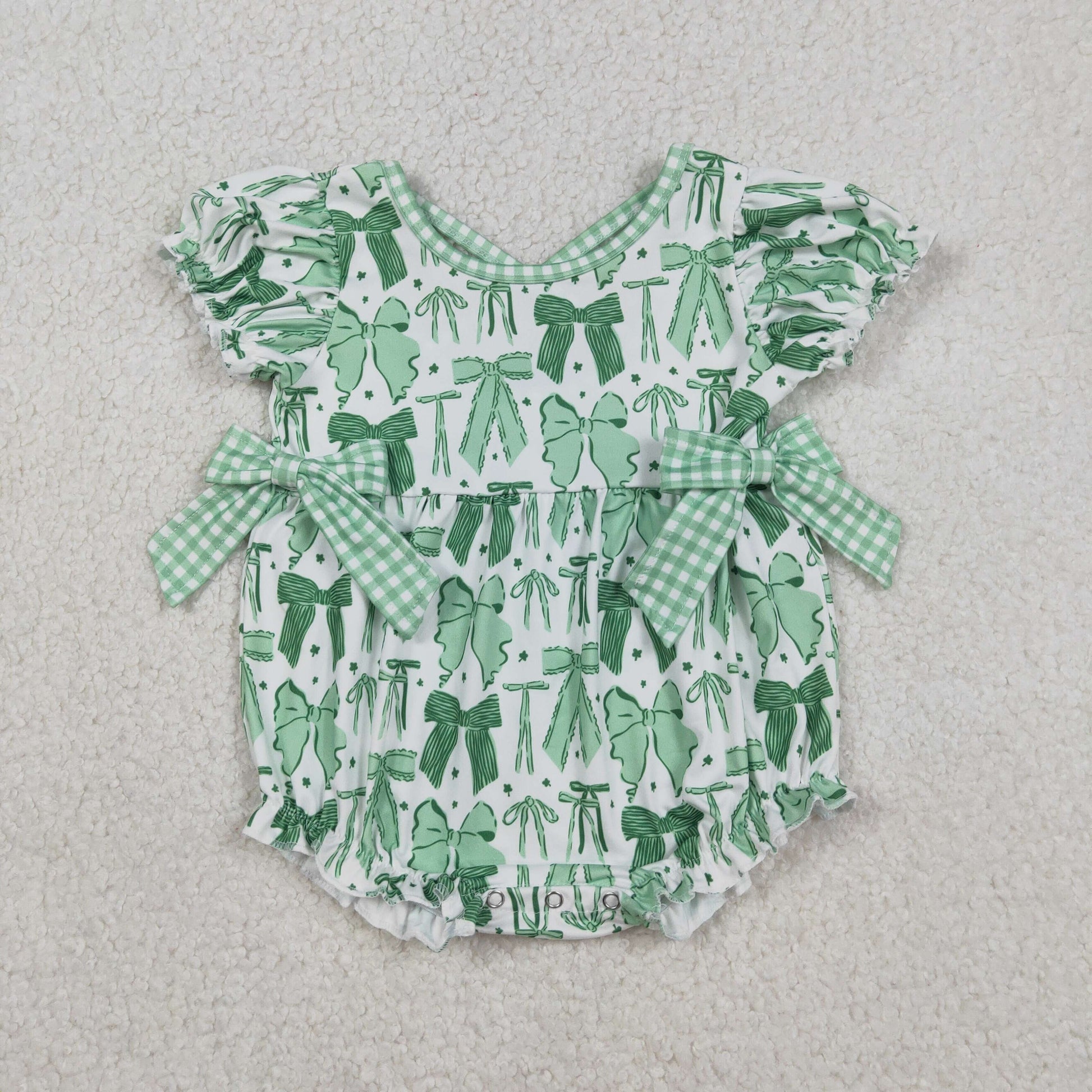 12.12 RTS NO MOQ (In stock)SR3305 Baby Girls Summer Rompers Baby Girls Green Clovers St Patrick Bows Ruffle Rompers