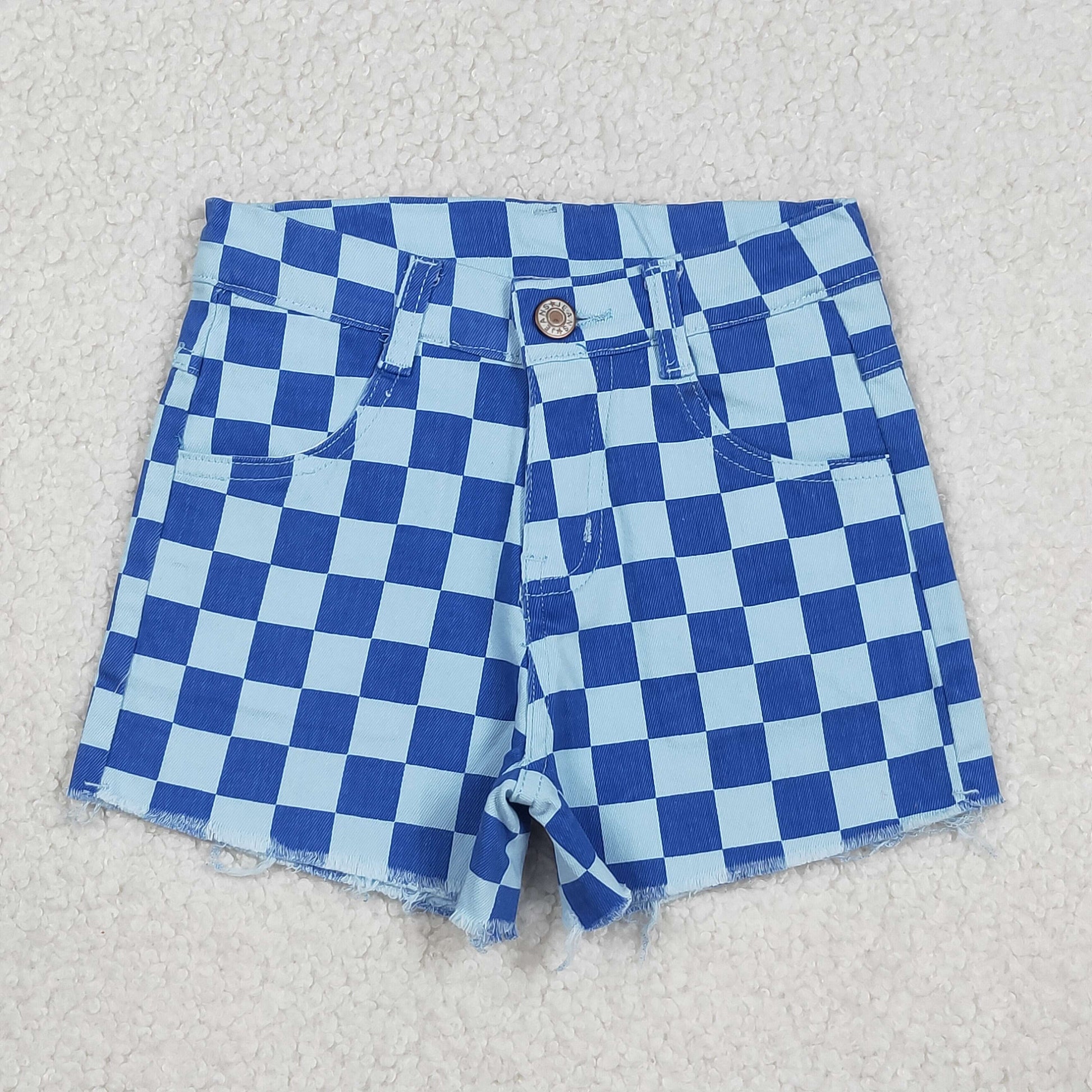 12.13 RTS NO MOQ (In stock)SS0763 Baby Girls Summer Shorts Baby Girls Blue Checked Pockets Denim Shorts Bottom