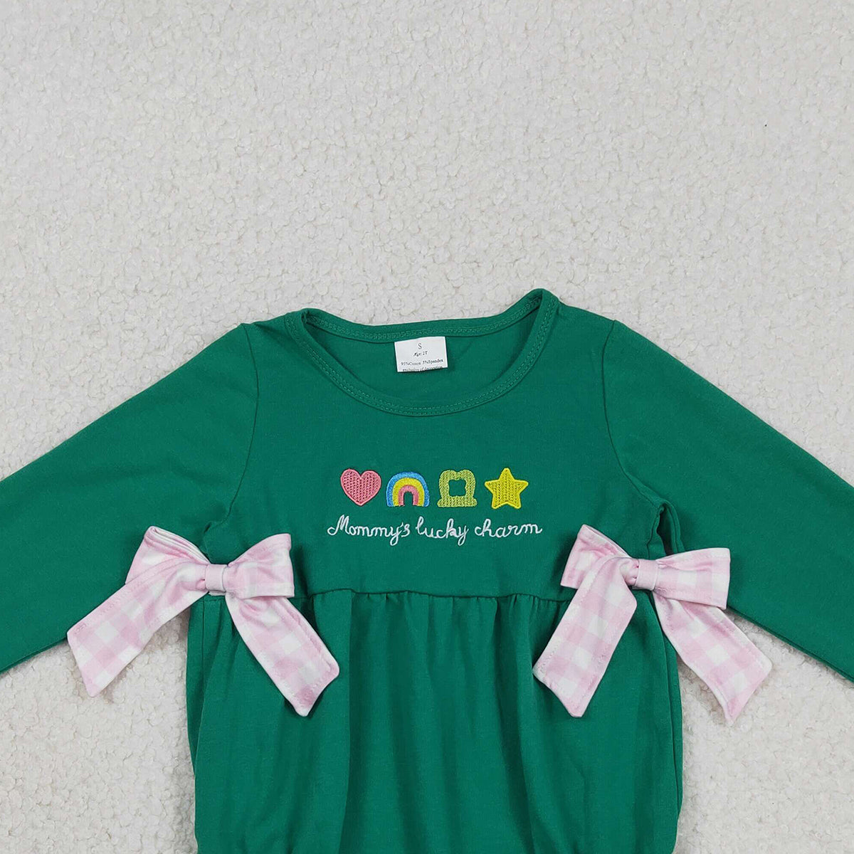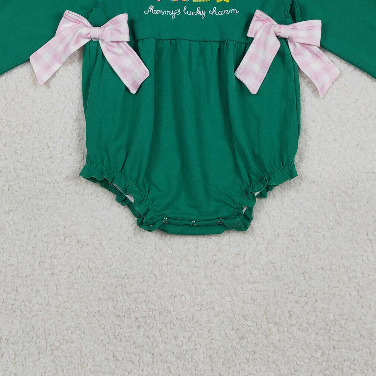 12.17 RTS NO MOQ (In stock)LR2839 Baby Girls Winter Rompers Embroidery Clovers Baby Girls Green Long Sleeve St Patrick Bows Ruffle Rompers