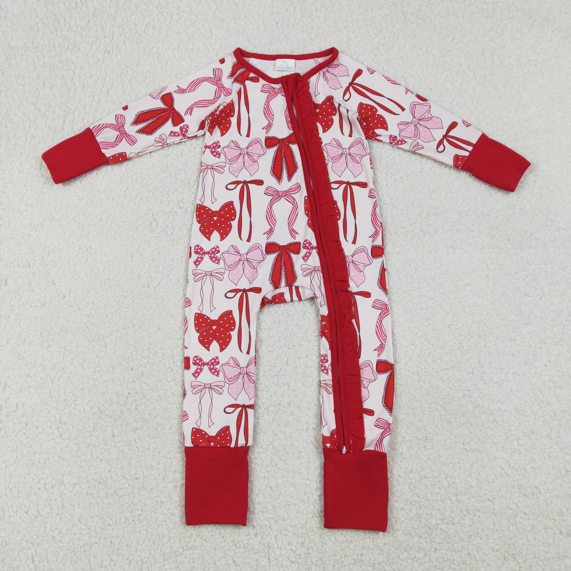12.23 RTS NO MOQ (In stock)LR2780 Baby Girls Winter Rompers Baby Girls Red Bows Plaid Valentines Two Way Ruffle Zip Convertible Rompers