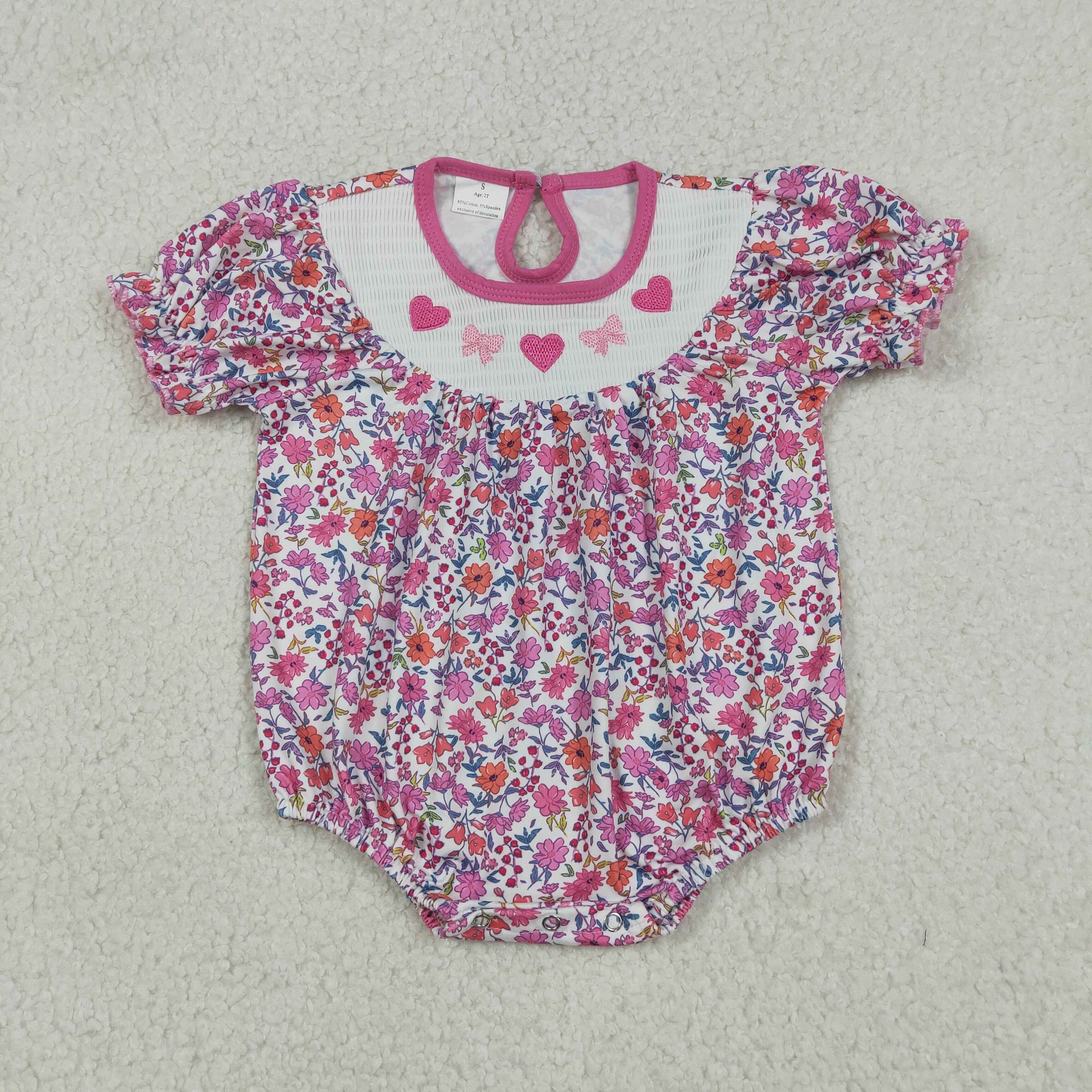 12.24 RTS NO MOQ (In stock)SR3465 Smocked Hearts Bows Baby Girls Flowers Valentines Ruffle Rompers