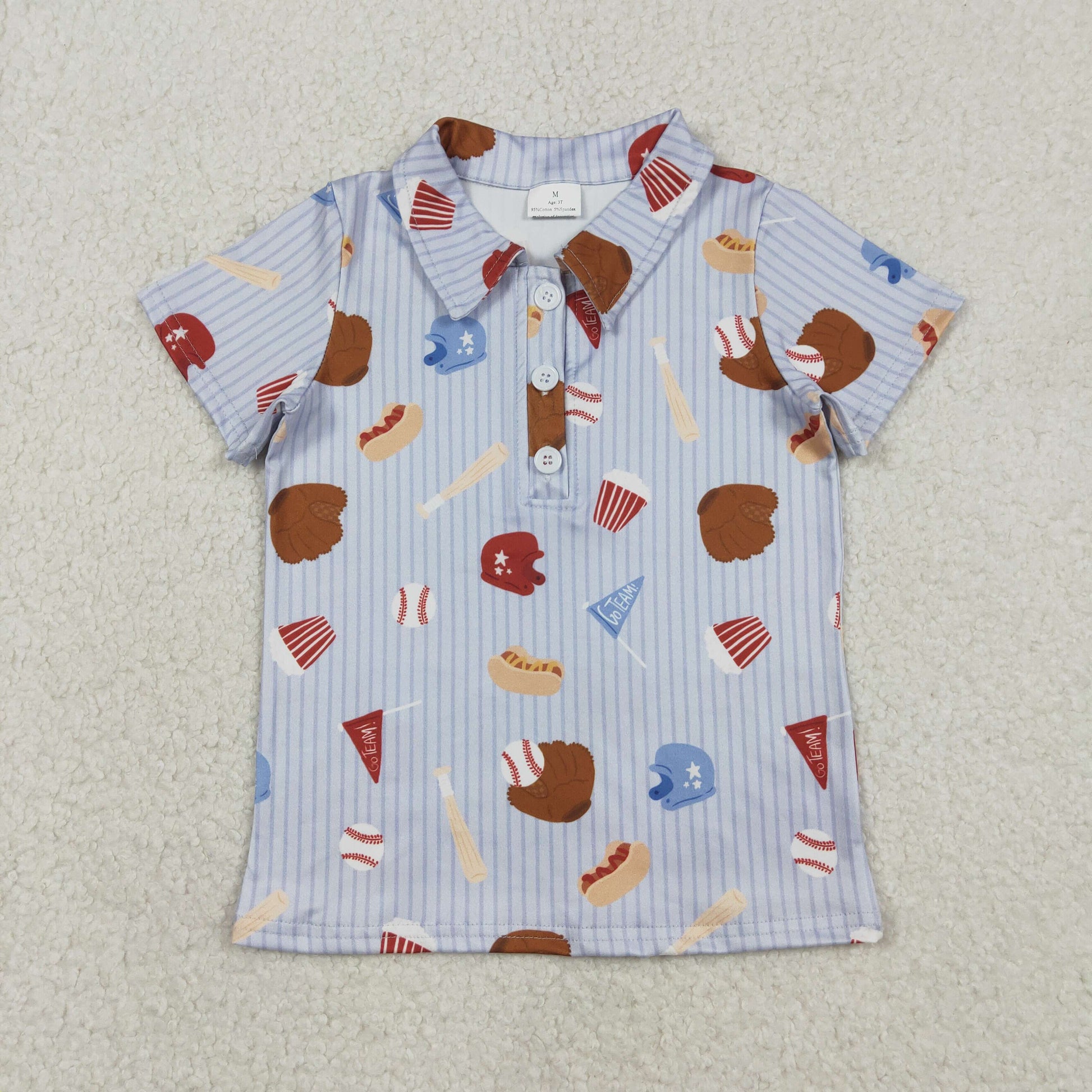 12.29 RTS NO MOQ (In stock)BT1580 Baby Boys Blue Stripe Baseballs Team Button Polo Shirts Top