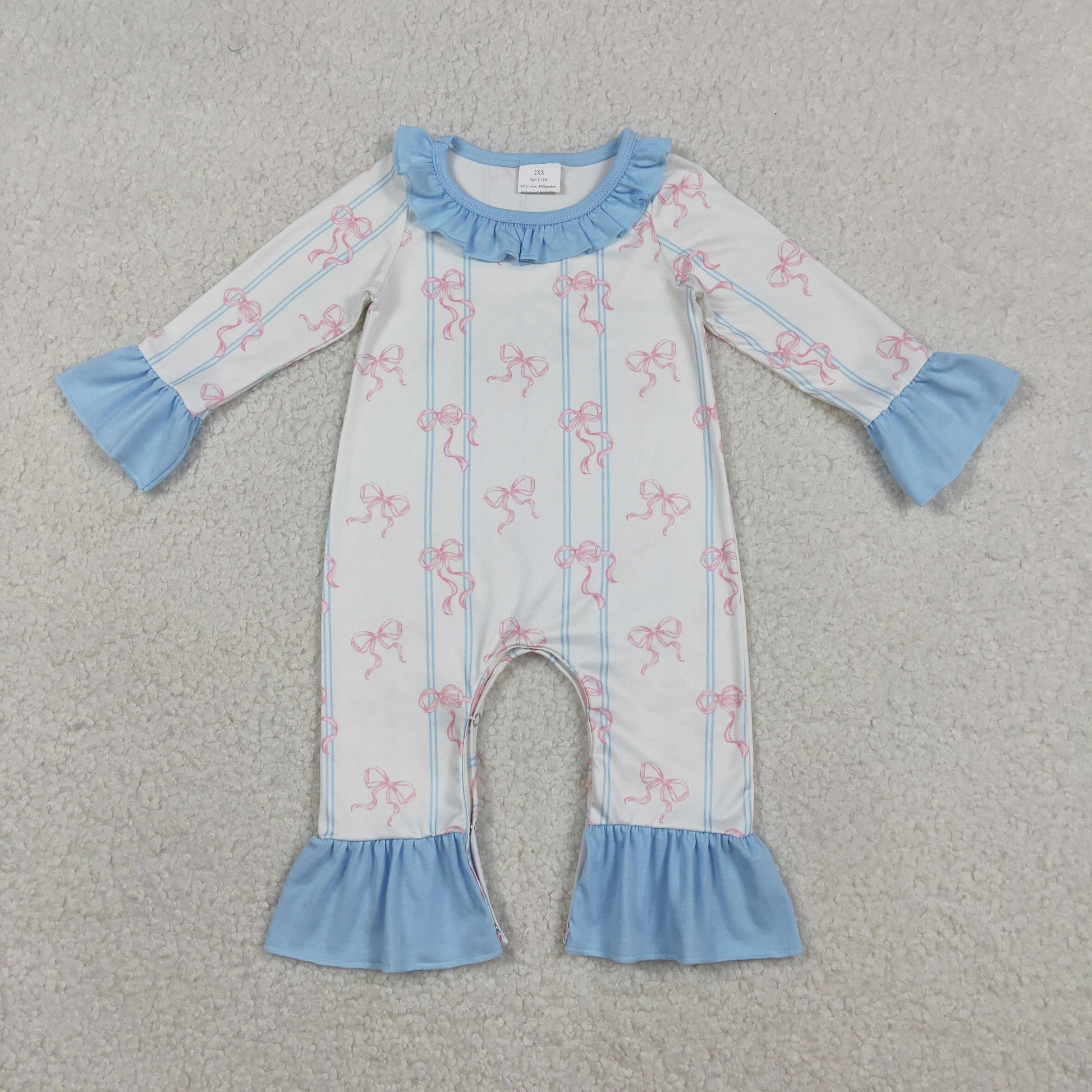 12.29 RTS NO MOQ (In stock)LR2845 Baby Girls Winter Rompers Baby Girls Pink Bows Stripe Collar Ruffle Foodie Rompers