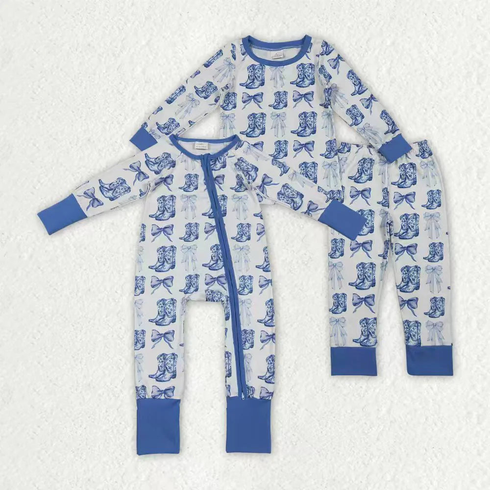 12.29 RTS Sibling Baby Girls Blue Bows Pants Top Pants Western Pajamas Set Zipper Rompers
