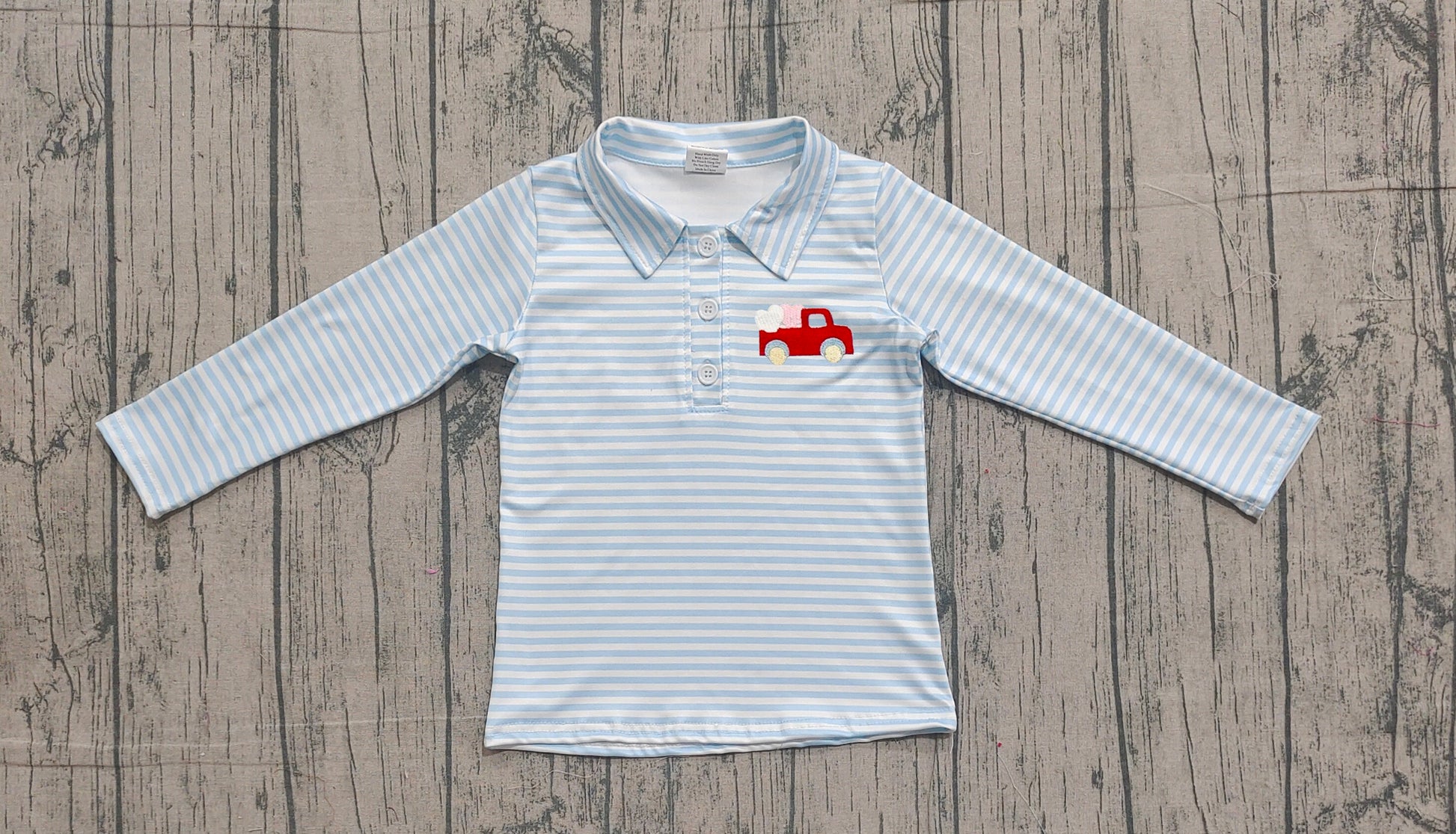 12.8 BT1573 Sample No Moq Embroidery Heart Trucks Baby Boys Blue Stripe Valentines Button Polo Shirts Top