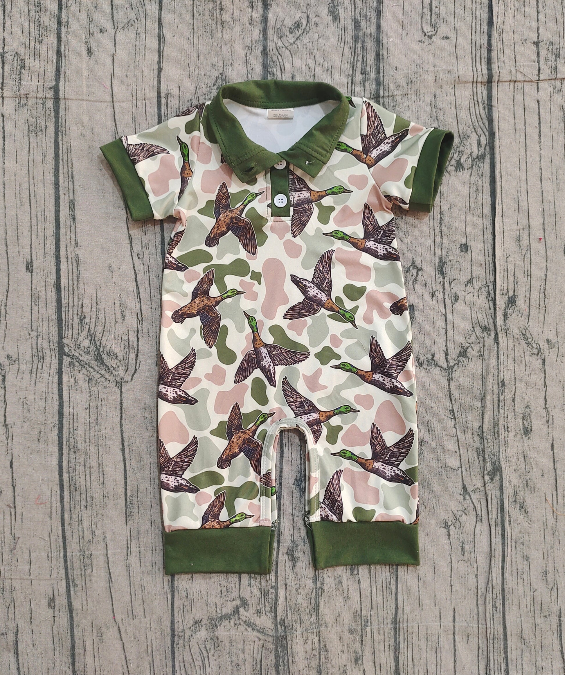 12.8 SR3634 Sample No Moq Baby Boys Ducks Camo Hunting Button Footie Rompers