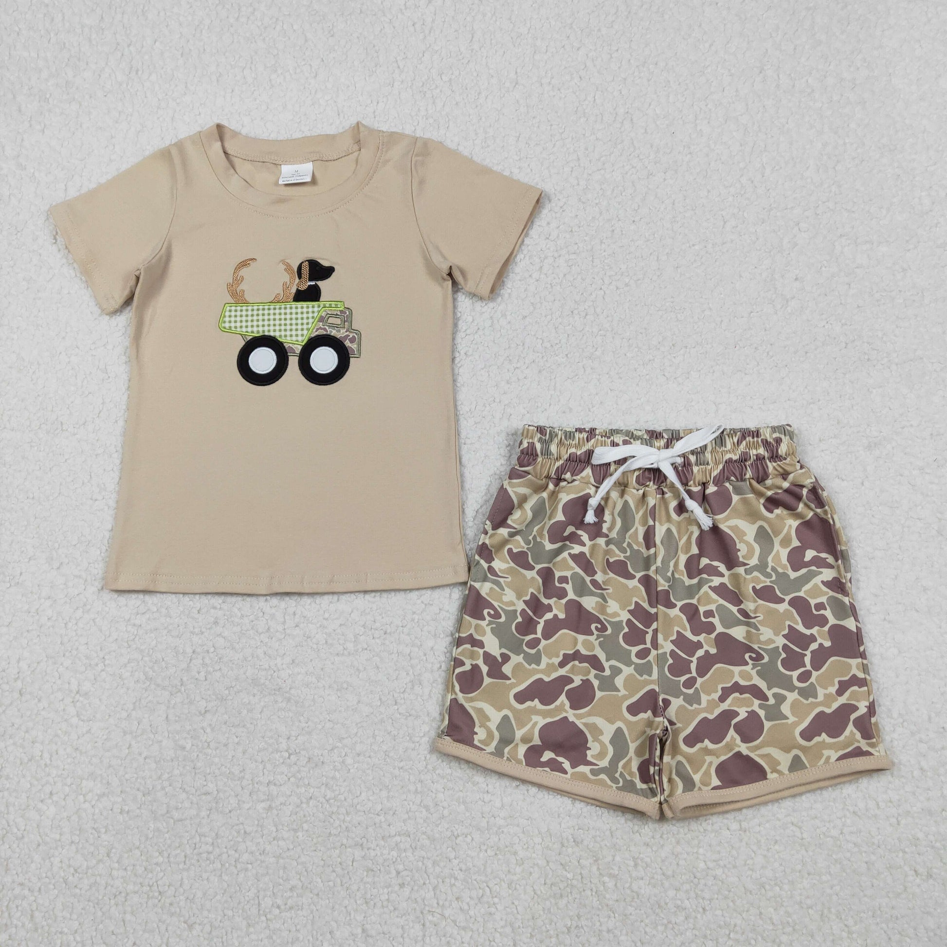 12.9 RTS NO MOQ (In stock)BSSO1576 Embroidery Deer Truck Baby Boys Khaki Top Camo Shorts Hunting Clothes Sets