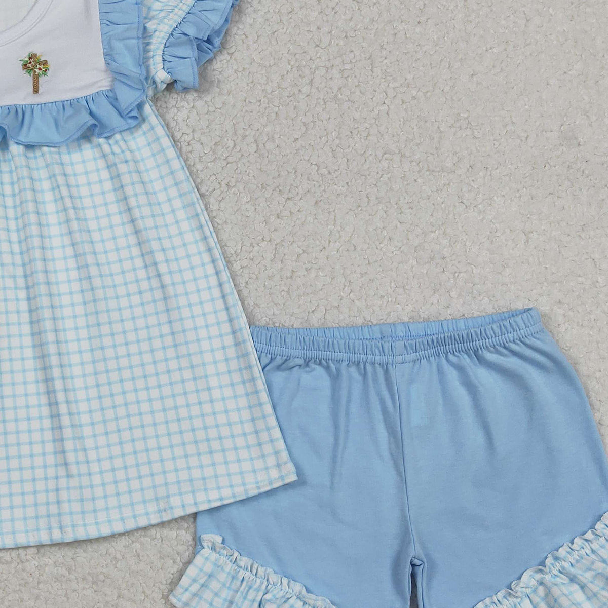 12.9 RTS NO MOQ (In stock)GSSO2718 Embroidery Crosses Baby Girls Blue Checked Tunic Ruffle Shorts Easter Clothes Sets
