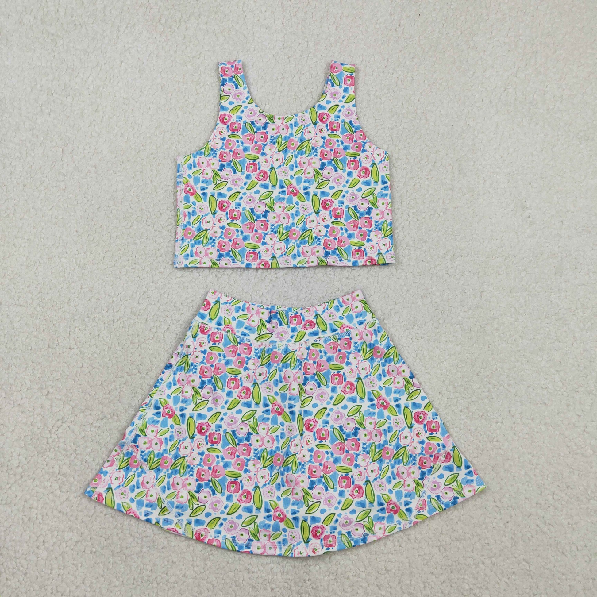 2.10 RTS NO MOQ (In stock)GSD1988 Kids Fashion Clothes Baby Girls Blue Pink Flowers Vest Top Shorts Skirts Yoga Active Set