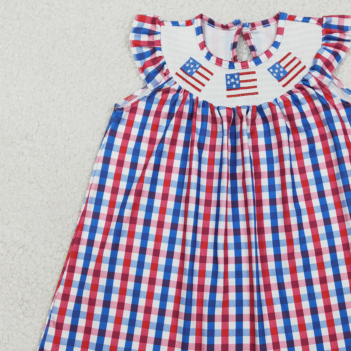 2.2 RTS NO MOQ (In stock)GSD3506 Baby Girls Smocked Flags Red Blue Checked 4th Of July Knee Length Dresses